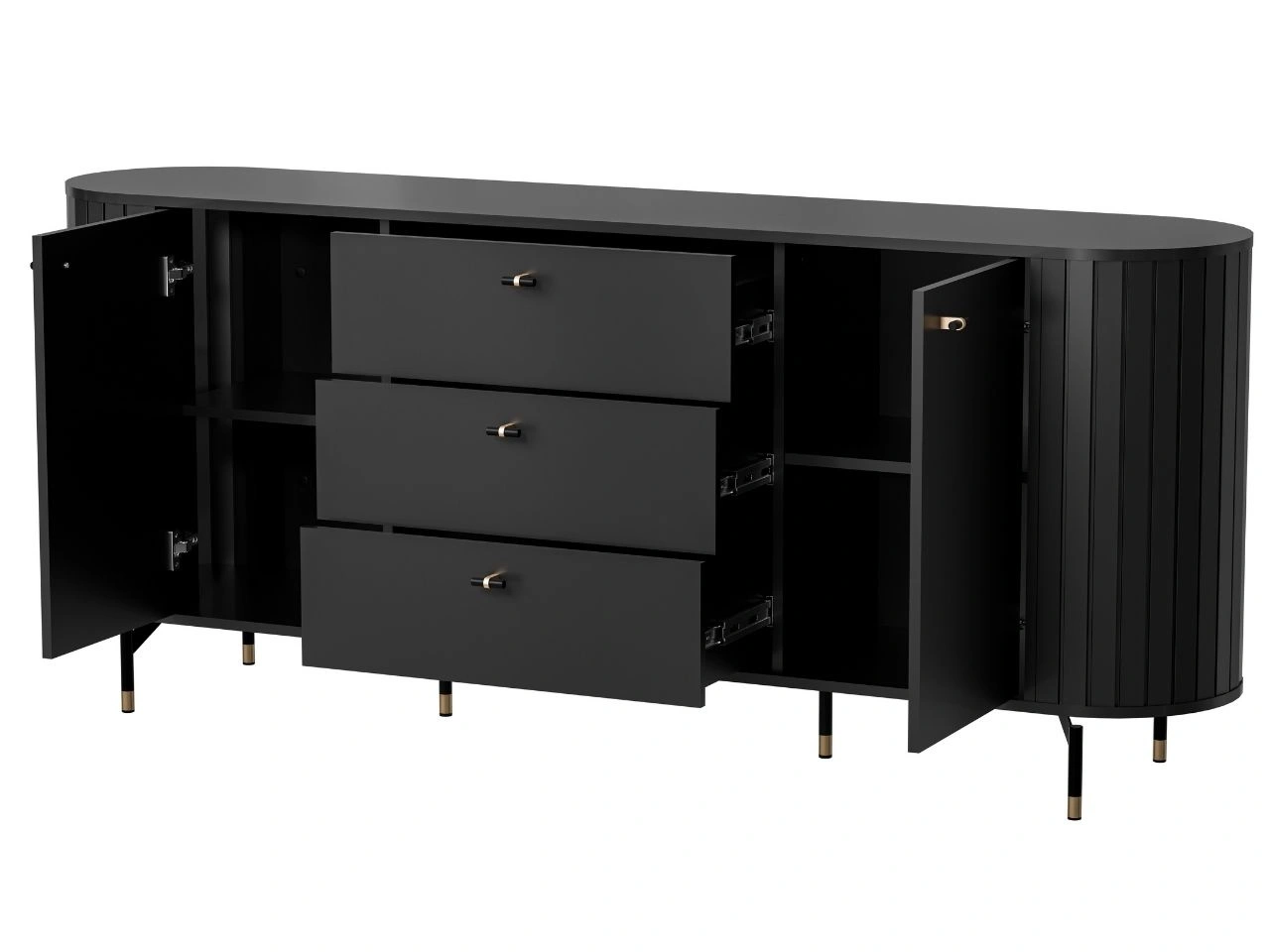 Kommoden Soria verbinden ästhetisches Design mit hoher Funktionalität. Großzügige Innenräume bieten komfortablen Stauraum und sorgen für Ordnung im Wohnbereich. Eine der Kommoden ist zusätzlich mit einem verglasten Element inklusive LED-Beleuchtung ausgestattet, das optisch an die Vitrine anknüpft und den dekorativen Charakter der Kollektion hervorhebt.