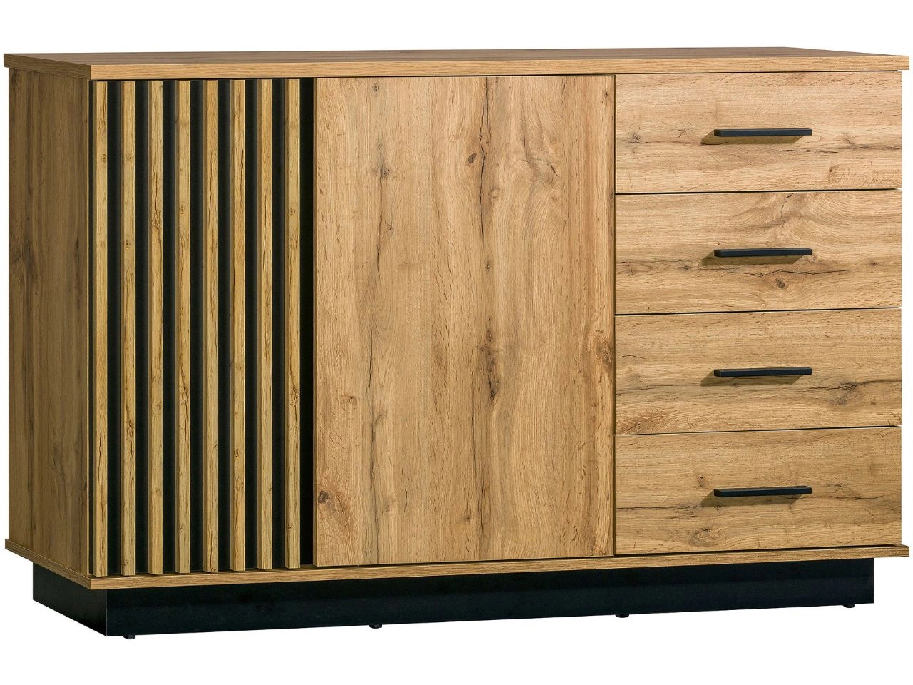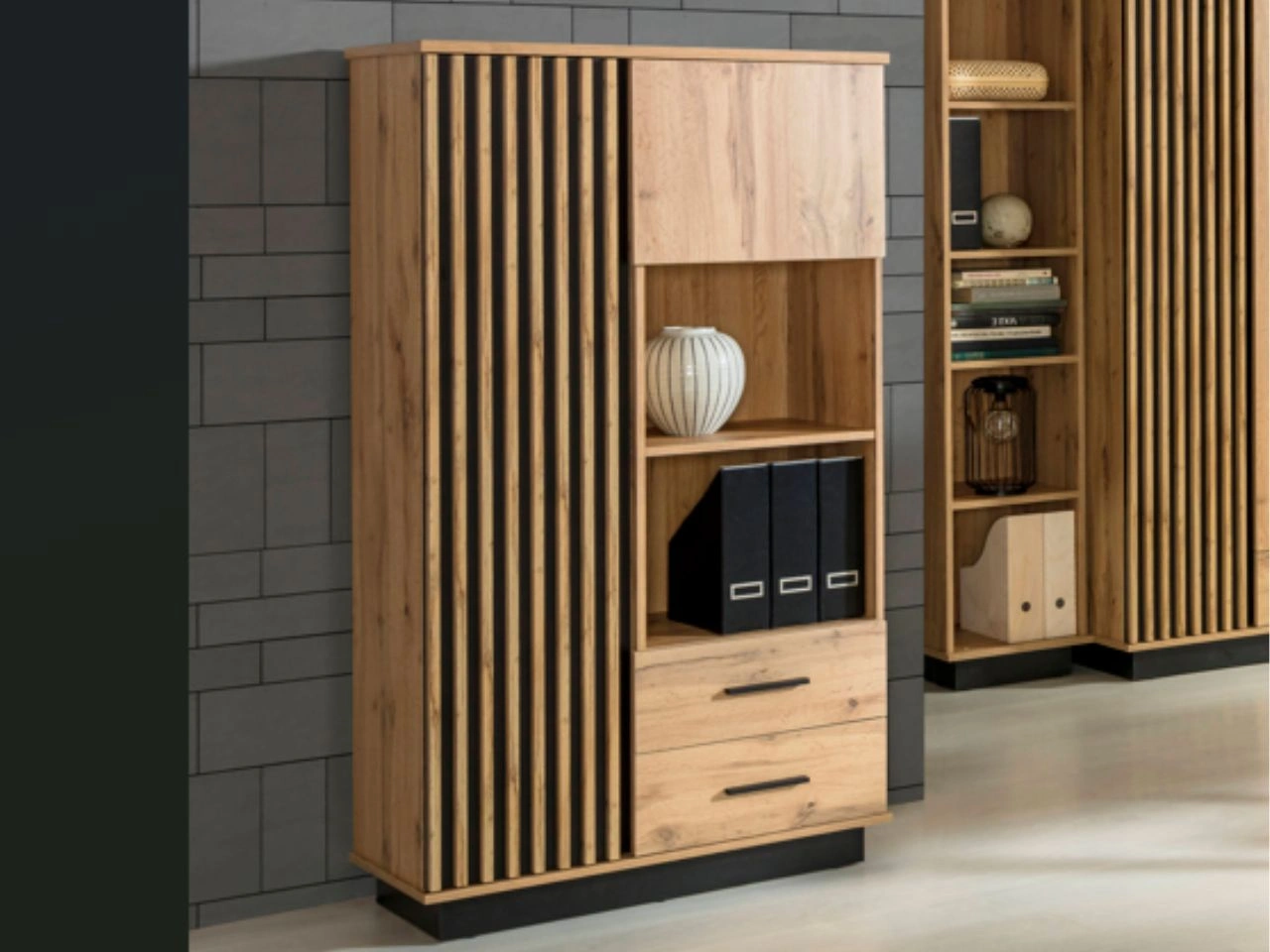 Das Wohnzimmermöbel-Set Lavore ist eine industrielle und harmonische Kollektion, die Funktionalität mit modernem Design im trendigen Mix aus warmem Wotan-Eiche und mattem Schwarz vereint. Charakteristische Lamellen auf den Fronten verleihen den Möbeln einen loftartigen Charakter und elegante Akzente, während die durchdachte Konstruktion jeder Einheit Komfort und maximale Raumnutzung garantiert. Alle Elemente aus langlebiger Laminatplatte, mit dekorativen MDF-Lamellen, die das moderne Industrial-Design betonen. Das Lavore-Set kombiniert Ästhetik, Langlebigkeit und praktische Lösungen, sodass das Wohnzimmer elegant, geordnet und gemütlich wirkt.