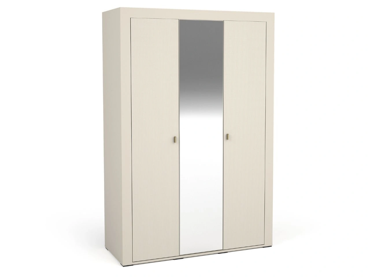 Die mittlere Tür ist mit einem großflächigen Spiegel ausgestattet, der den Raum optisch vergrößert und den täglichen Komfort erhöht. Sowohl Fronten als auch Korpus bestehen aus laminierter Spanplatte, was für Stabilität, Langlebigkeit und eine ästhetische Oberfläche sorgt. Die matten Fronten werden durch dekorative MDF-Leisten ergänzt, die die charakteristische vertikale Rillenstruktur bilden.