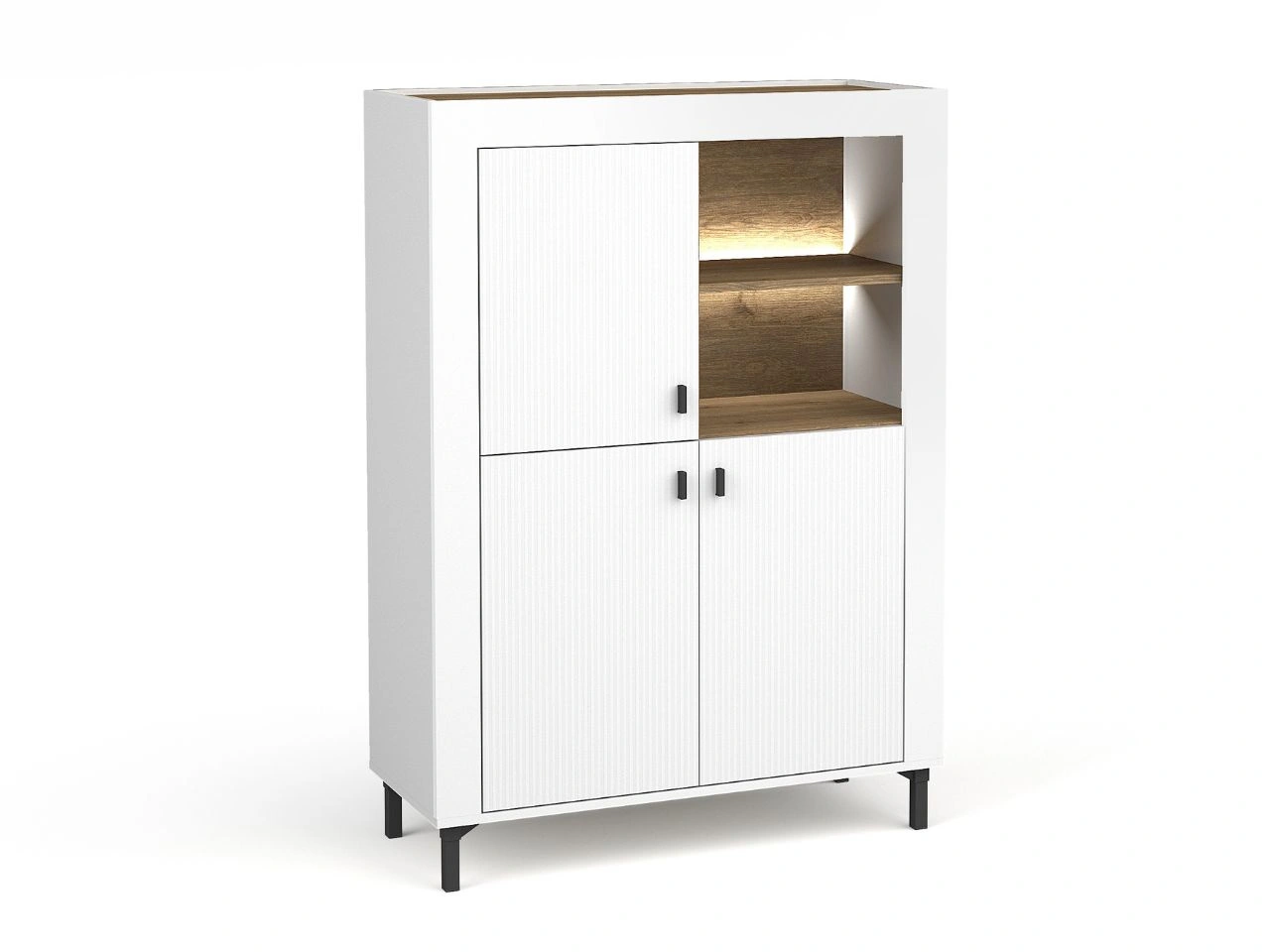 Die Kommode Messina wurde als Möbelstück mit Stauraum- und Präsentationsfunktion konzipiert. Der teilweise verglaste Bereich ermöglicht eine stilvolle Präsentation von Dekorationen, Glas oder Accessoires, während geschlossene Fächer Platz für Alltagsgegenstände bieten. Die integrierte LED-Beleuchtung ist im Lieferumfang enthalten und setzt den Vitrinenbereich stimmungsvoll in Szene.