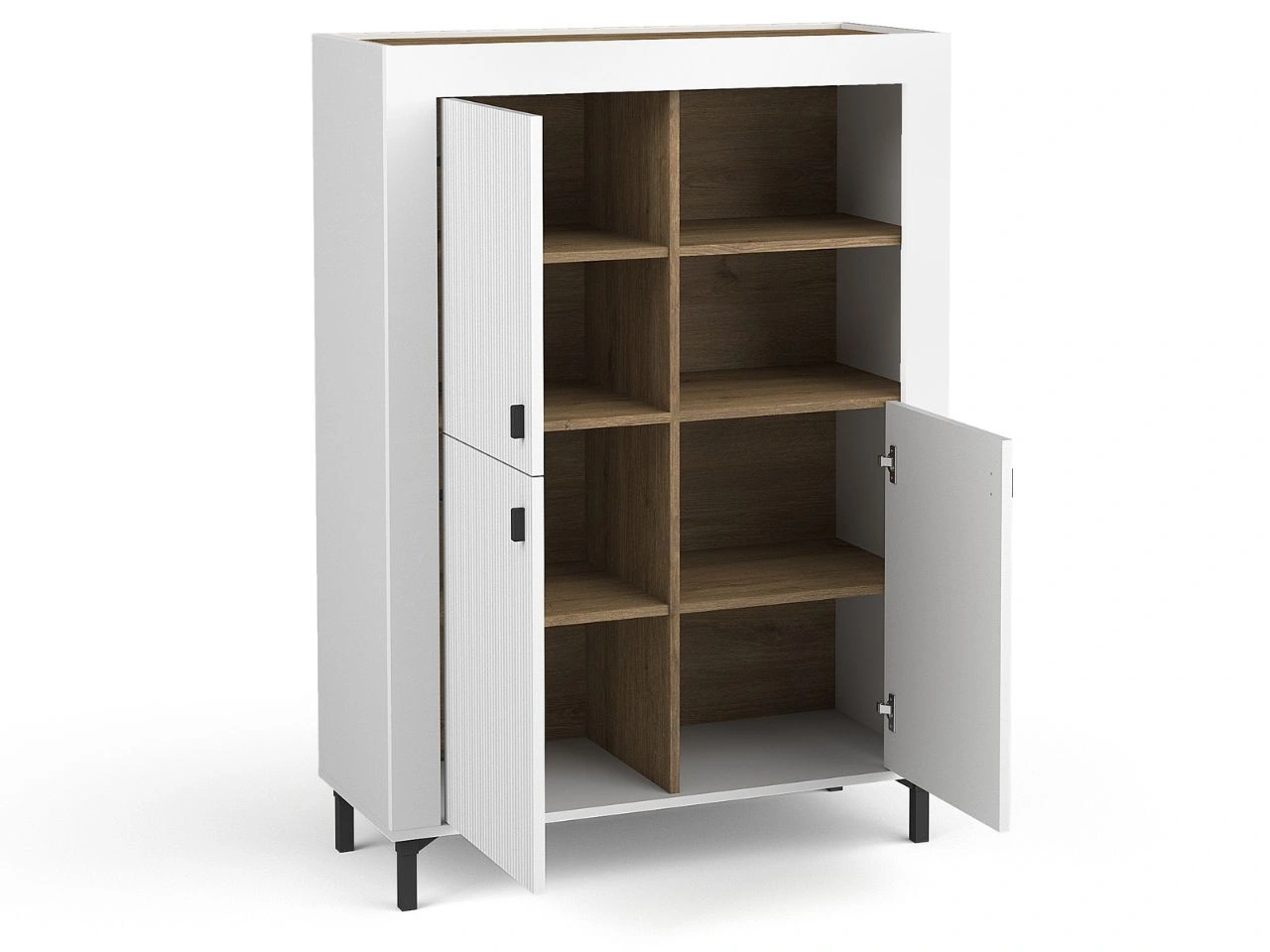 Der Korpus der Kommode besteht aus langlebiger laminierter Spanplatte, während die Fronten aus hochwertiger MDF-Platte gefertigt sind. Dies gewährleistet Stabilität, Widerstandsfähigkeit im täglichen Gebrauch sowie eine ansprechende Optik über viele Jahre hinweg. Die vertikalen Riffelungen verleihen der Kommode einen modernen, architektonischen Charakter, während das Innere im Dekor Eiche Whisky einen warmen, natürlichen Akzent setzt.