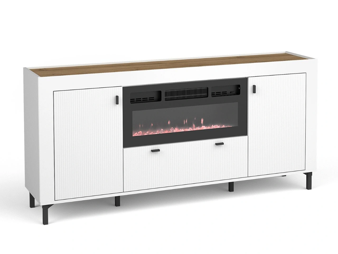 Kommode Messina mit elektrischem Kamin ist ein modernes Möbelstück, das für Innenräume entworfen wurde, in denen Funktionalität, Ästhetik und eine gemütliche Atmosphäre gleichermaßen wichtig sind. Die schlichte, elegante Form wird durch vertikale Riffelungen auf den MDF-Fronten aufgewertet, die dem Möbel einen ausdrucksstarken, architektonischen Charakter verleihen und den modernen Stil der Kollektion unterstreichen.