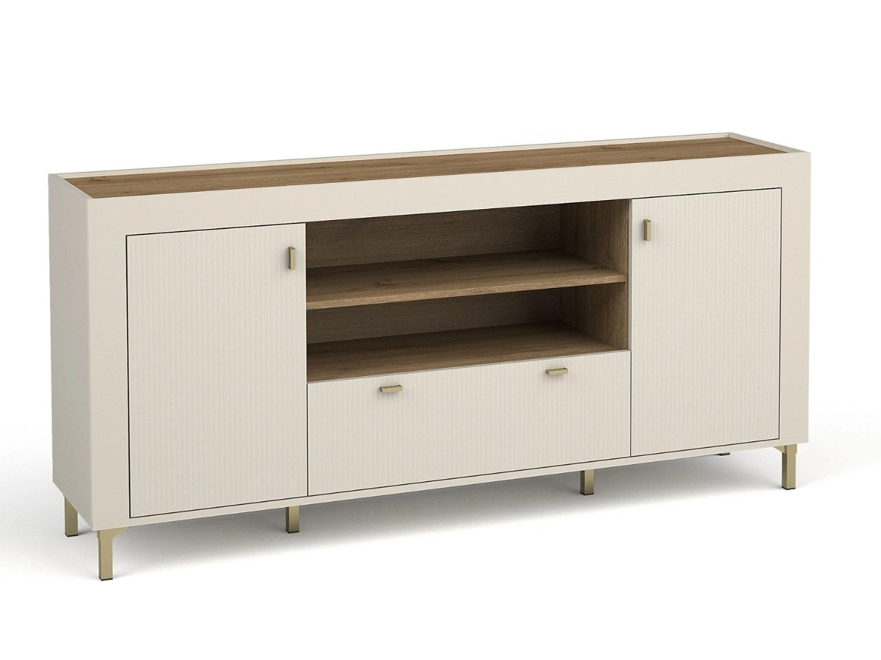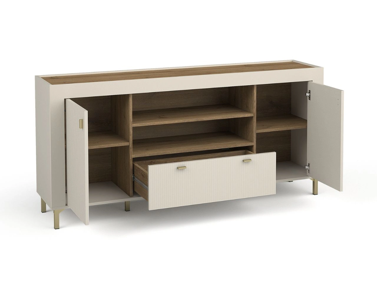 Das Möbelset Messina in einer hellen, eleganten Farbgebung unterstreicht den aufgeräumten und harmonischen Charakter moderner Wohnbereiche und verbindet zeitgemäßes Design mit einer warmen, einladenden Atmosphäre im Wohn- und Esszimmer. Der dezente Kaschmirton in Kombination mit vertikalen Rillen auf den matten MDF-Fronten sowie Holzakzenten sorgt für Ruhe, Leichtigkeit und zeitlose Eleganz. Das Set Messina ist in drei Farbvarianten erhältlich: Schwarz, Kaschmir und Weiß, wodurch es sich problemlos an unterschiedliche Einrichtungsstile und Raumkonzepte anpassen lässt.