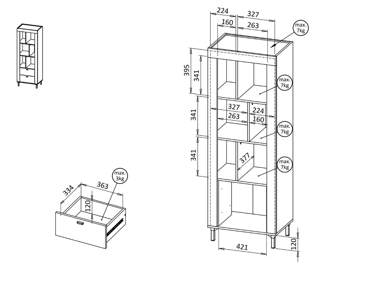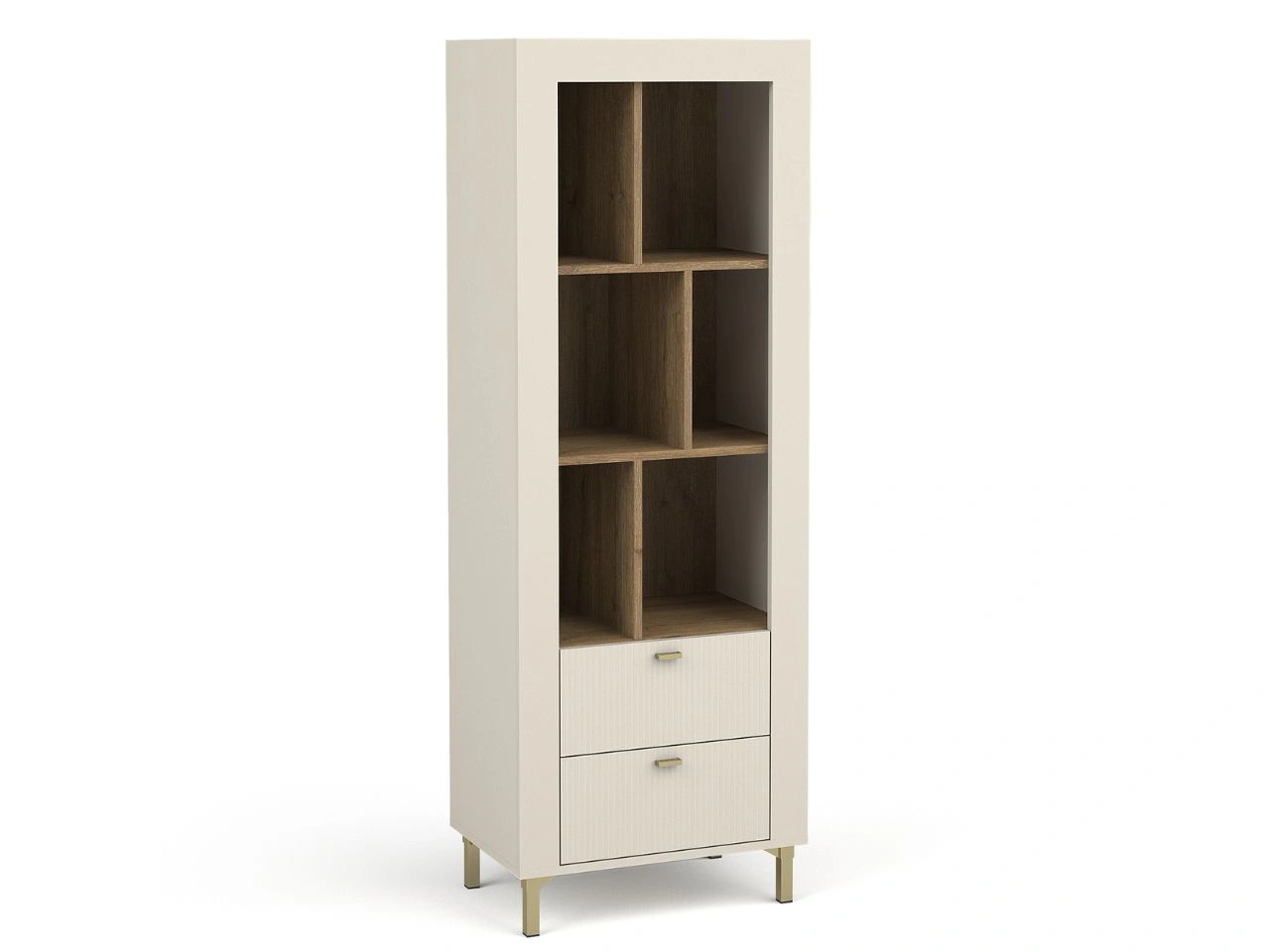 Das Regal Messina bringt Leichtigkeit und eine klare Struktur in die Einrichtung, indem es offene Regalfächer mit praktischen Schubladen kombiniert. Diese Lösung erlaubt sowohl die stilvolle Präsentation von Büchern, Dekorationen oder Sammlerstücken als auch die diskrete Aufbewahrung kleiner Alltagsgegenstände und schafft ein ausgewogenes Verhältnis zwischen offenen und geschlossenen Bereichen.
