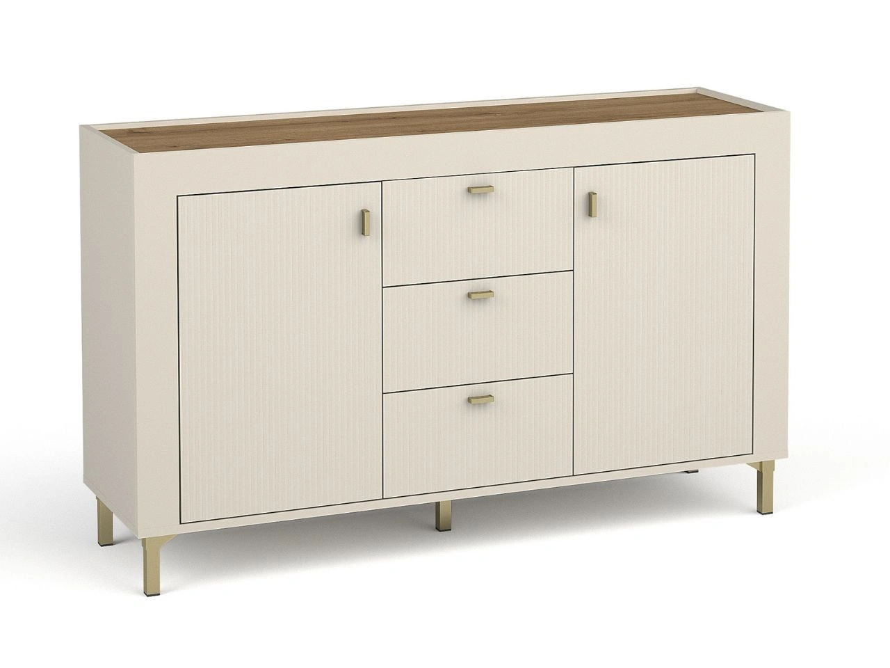Die Kommode Messina erfüllt im Set die Funktion eines praktischen und dekorativen Stauraummöbels. Der Korpus ist mit zwei geschlossenen Schrankfächern sowie drei geräumigen Schubladen ausgestattet und ermöglicht eine komfortable Organisation von Geschirr, Textilien oder kleinen Accessoires, sodass ein aufgeräumtes Gesamtbild im Wohnbereich erhalten bleibt.