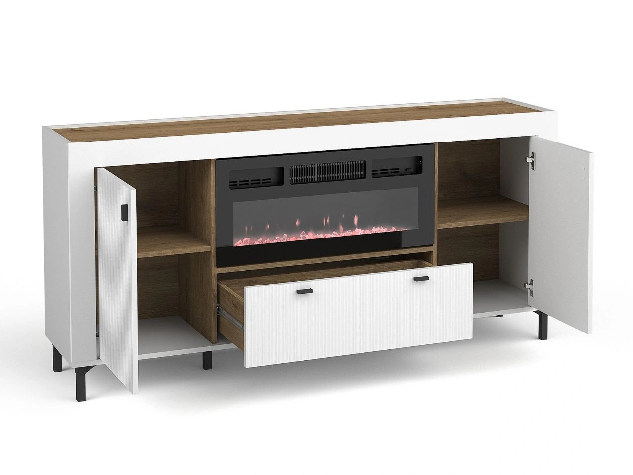 Die Kommode Messina mit elektrischem Kamin verbindet dekorative Wirkung mit praktischer Stauraumfunktion. Der integrierte Kamin ermöglicht die Steuerung der Flammenfarbe per Fernbedienung, bietet eine Heizfunktion mit Temperaturregelung, zwei Gebläsestufen sowie einen Timer, mit dem sich die Betriebszeit von 1 bis 8 Stunden einstellen lässt.