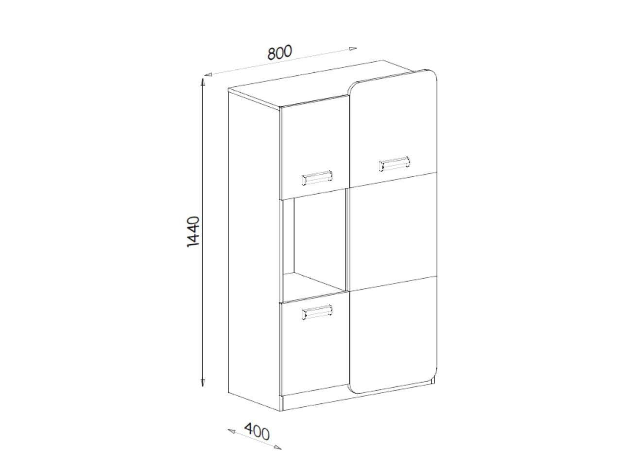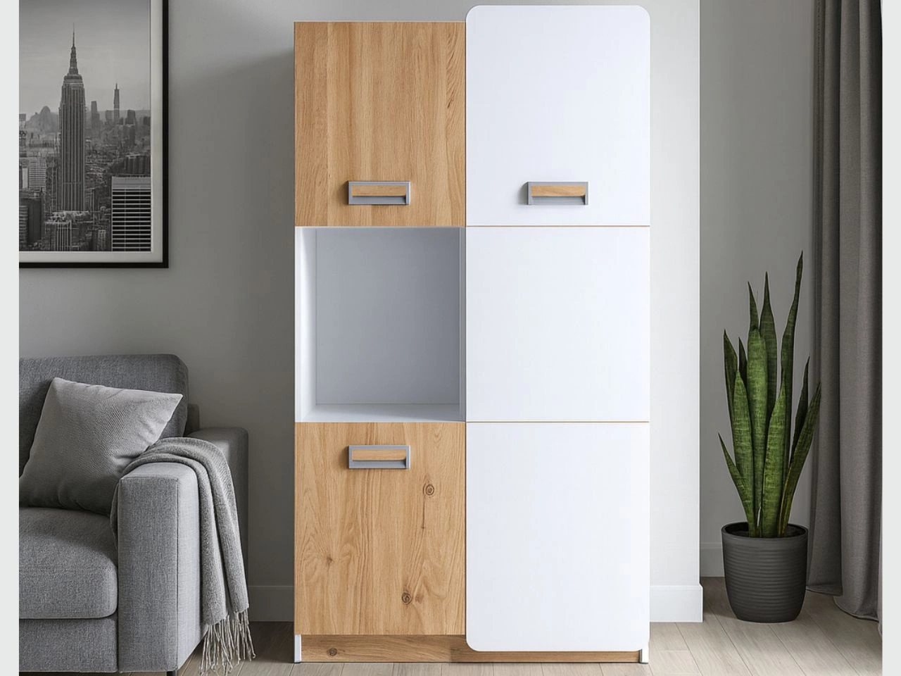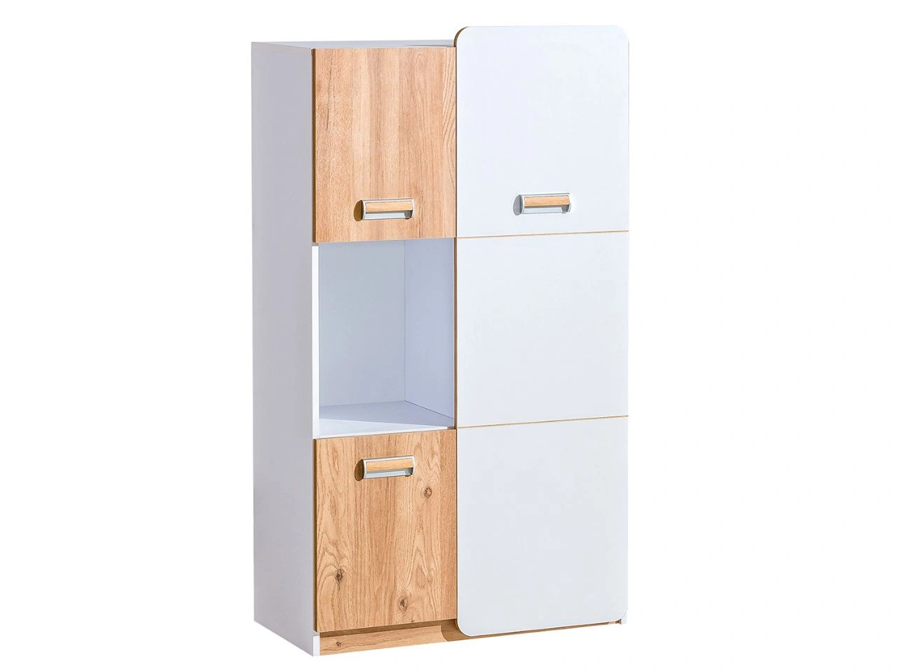 Das Bücherregal ist ein vielseitiges Jugendzimmermöbel, das sich sowohl zur Aufbewahrung von Büchern, Heften und Dekorationen eignet als auch dabei hilft, das Zimmer ordentlich zu halten. Drei Türen verbergen geräumige Einlegeböden, während zusätzlicher offener Stauraum die Möglichkeit bietet, Lieblingsgadgets oder kleinere Gegenstände dekorativ zu präsentieren. Die Kunststoffgriffe sorgen für einfaches Öffnen. Dieses Jugendzimmerregal vereint stabile Konstruktion mit funktionalem Design und ist ideal für ein dynamisches Teenagerzimmer.