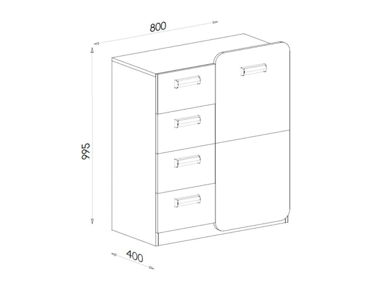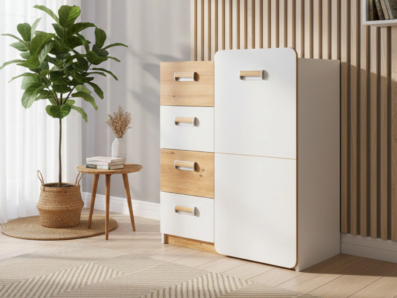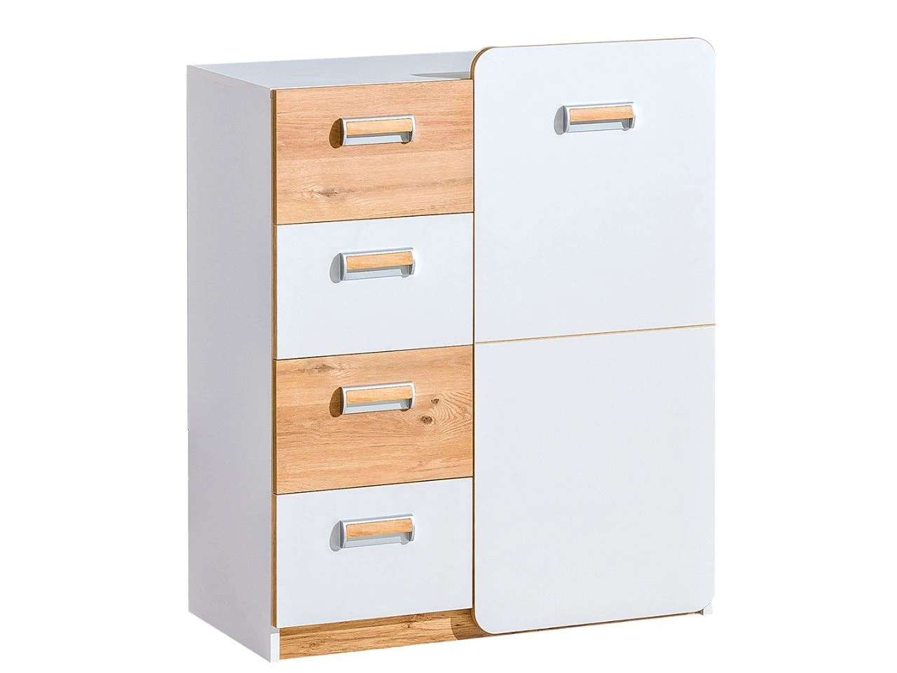 Die Kommode mit Schubladen ist ein funktionales und modernes Jugendzimmermöbel, das praktischen Stauraum mit durchdachtem Design verbindet. Vier Schubladen auf Kugelführung sorgen für ein sanftes und geräuschloses Öffnen und bieten viel Platz für kleinere Accessoires. Eine zusätzliche Tür verbirgt geräumige Einlegeböden, ideal zur Aufbewahrung größerer Gegenstände oder Bücher. Die stabile Konstruktion und das durchdachte Layout machen die Jugendzimmerkommode zu einem praktischen Möbelstück, das Ordnung schafft und gleichzeitig Ästhetik und modernen Stil vereint.
