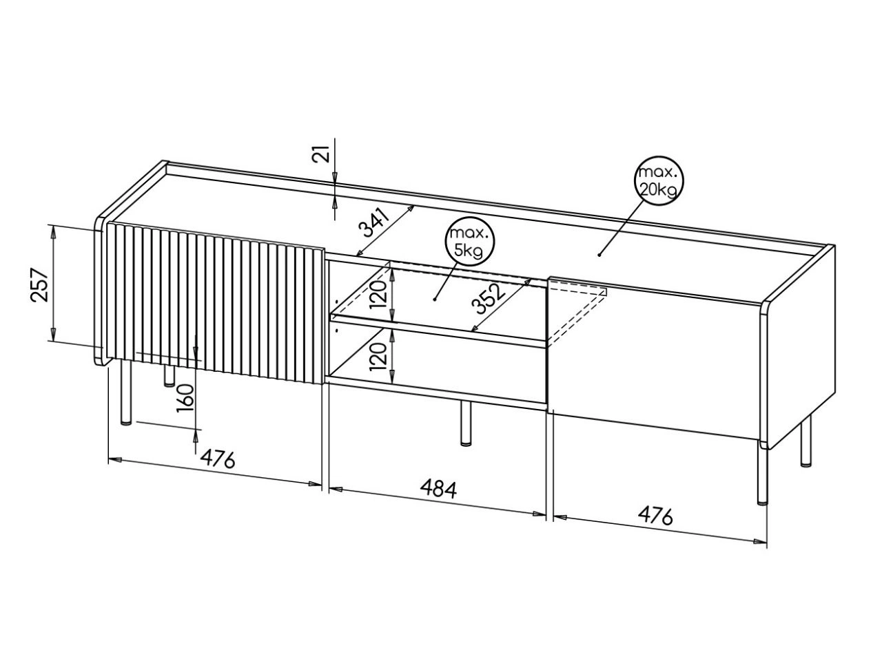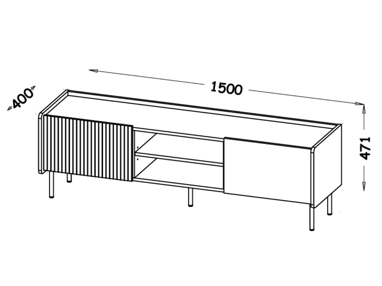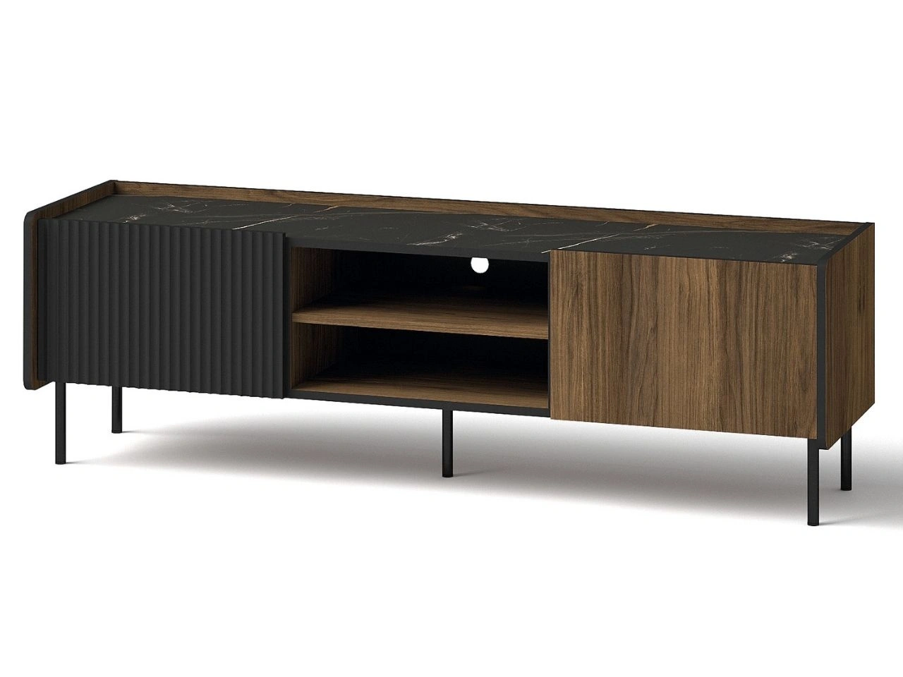 Das TV-Lowboard wurde für eine komfortable Nutzung von Unterhaltungselektronik konzipiert. Es verfügt über einen offenen Bereich mit Einlegeböden, ideal für Receiver, Konsole oder Mediaplayer, sowie über geschlossene Stauräume an den Seiten zur ordentlichen Aufbewahrung von Zubehör. Eine praktische Kabeldurchführung erleichtert die Organisation der Kabel und sorgt für ein aufgeräumtes Erscheinungsbild.
