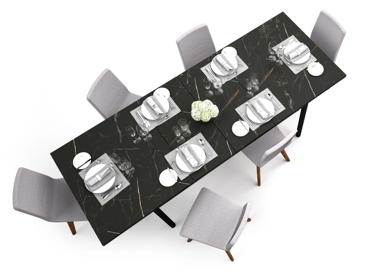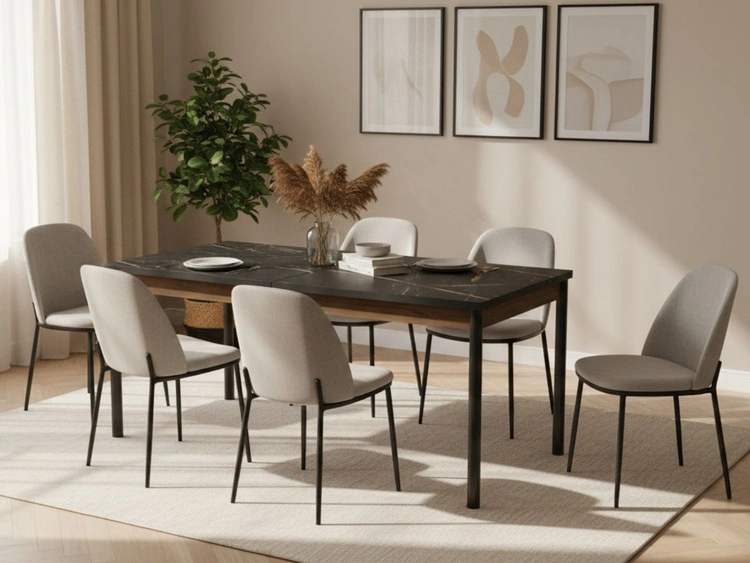 Die Tischplatte in der Ausführung San Sebastian, inspiriert von der Struktur von Naturstein, unterstreicht den hochwertigen, modernen Charakter des Tisches und bietet eine langlebige sowie komfortable Nutzfläche. Die sorgfältig ausgearbeitete Konstruktion sorgt für ein ästhetisches Erscheinungsbild sowohl im geschlossenen als auch im ausgezogenen Zustand.