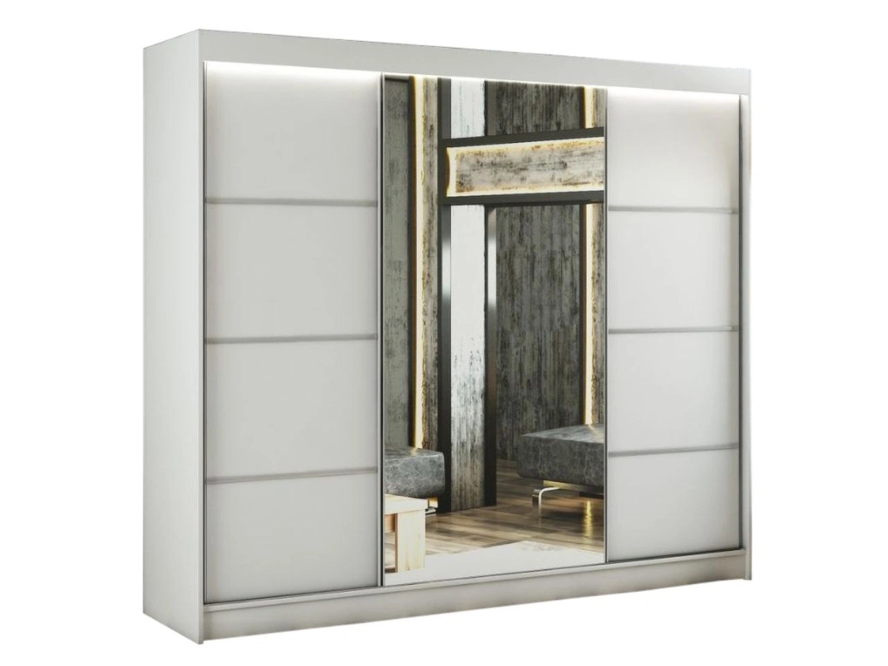 Die Fronten des Schranks Portel sind mit Möbelglas sowie einem Spiegel versehen, der den Raum optisch vergrößert und zusätzlich aufhellt. Ergänzt wird das Design durch eine integrierte LED-Beleuchtung, die die moderne Optik betont und den Nutzungskomfort bei Dunkelheit erhöht. Damit ist Portel ein moderner Schwebetürenschrank mit Spiegel und LED, ideal für große, elegante Wohnarrangements.