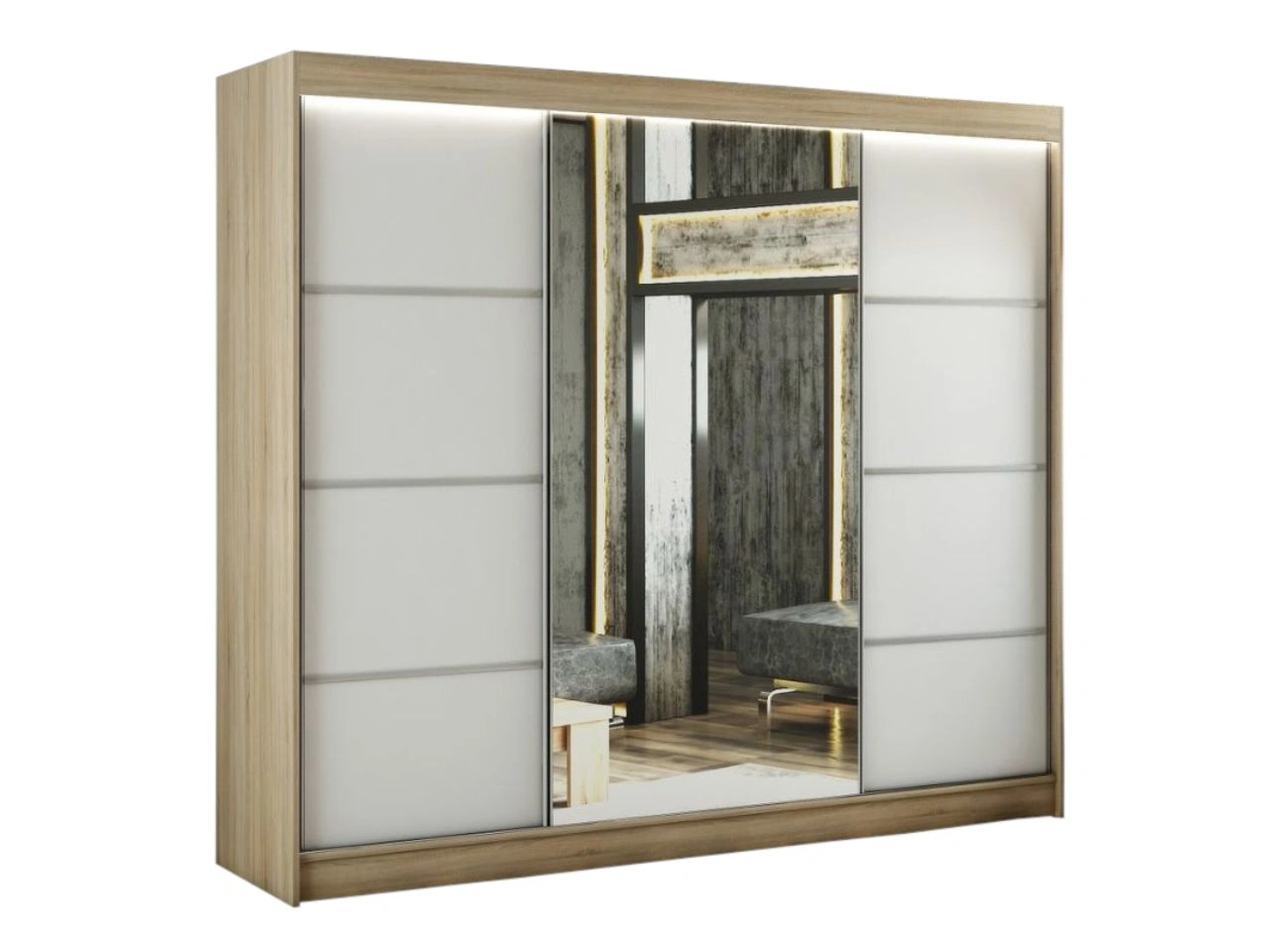 Schiebetürenschrank mit Spiegel 250 cm mit LED-Beleuchtung Portel Weiß, Eiche Sonoma