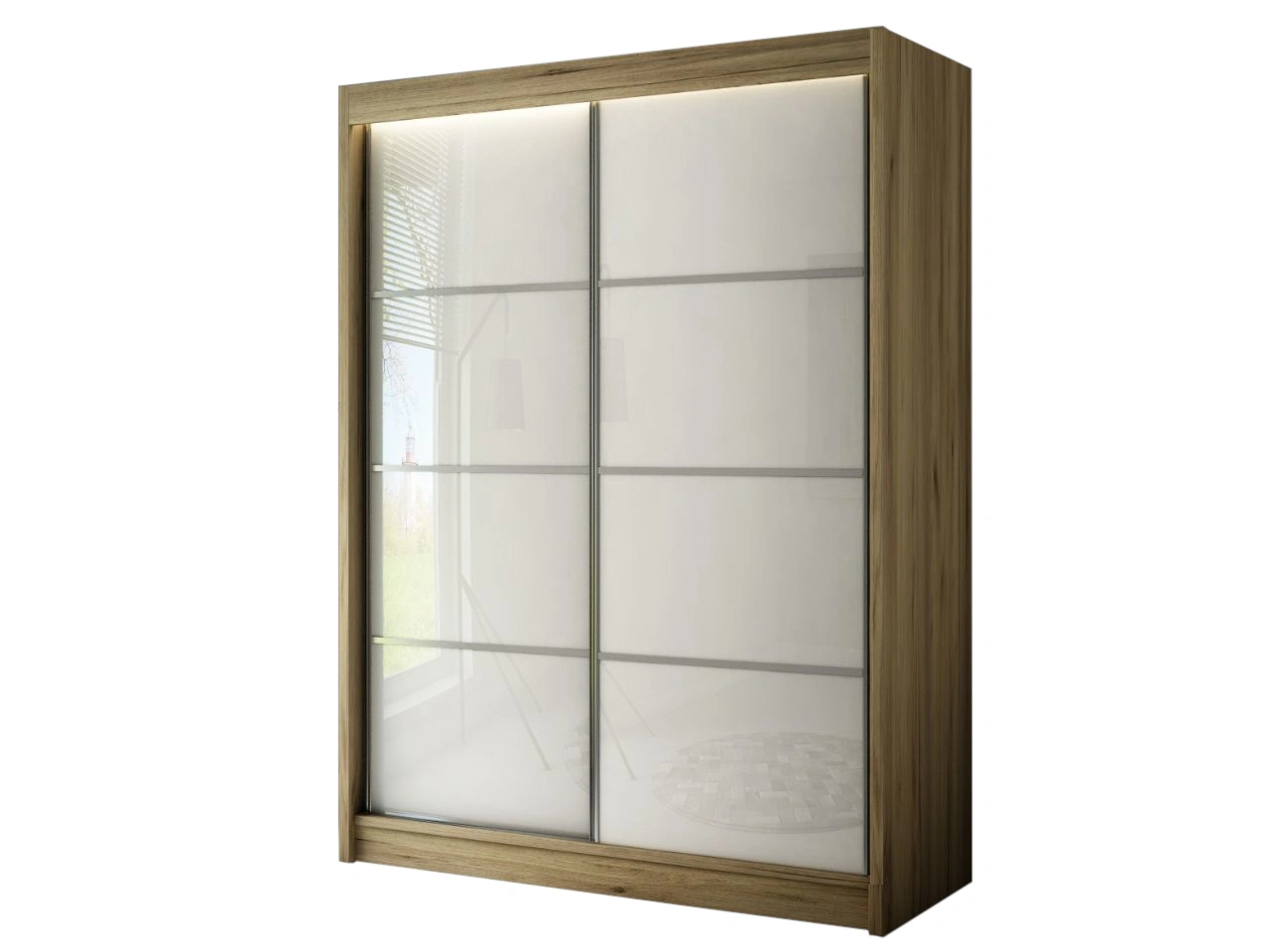 Schiebetürenschrank mit Sprossen 150 cm mit LED-Beleuchtung Ponti Handwerk Goldene Eiche, Weiß