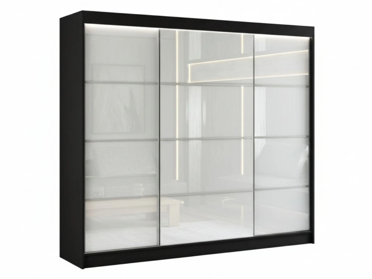 Schwebetürenschrank Ponti ist eine elegante und moderne Lösung für Schlafzimmer, Ankleidezimmer oder Flur, entworfen mit Fokus auf Funktionalität und ausdrucksstarkes Design. Die Fronten bestehen aus Lacobel, also gehärtetem, rückseitig lackiertem Glas, das sich durch eine perfekt glatte Oberfläche, intensive Farbwirkung und hohe Widerstandsfähigkeit im täglichen Gebrauch auszeichnet. Dekorative Aluminium-Sprossen verleihen dem Möbel einen exklusiven, modernen Charakter und passen ideal zu Loft- und minimalistischen Einrichtungen.