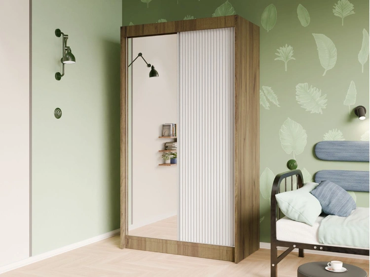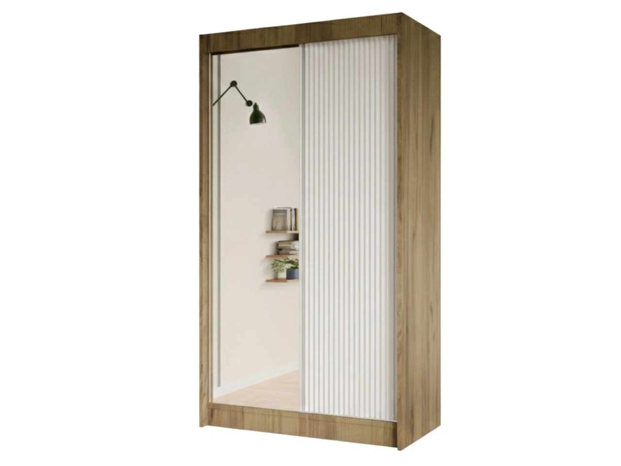 Schiebetürenschrank mit geriffelter Front und Spiegel 120 cm Fano Handwerk Goldene Eiche, Weiß