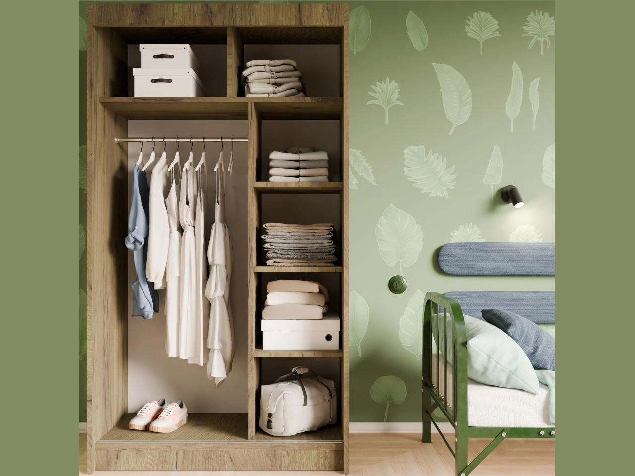 Der Innenraum des Schranks Fano ist auf eine komfortable und funktionale Nutzung ausgelegt und mit Kleiderstangen sowie praktischen Einlegeböden ausgestattet, die eine übersichtliche Organisation von Kleidung und Accessoires ermöglichen.