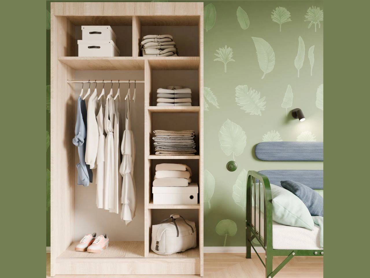 Der Innenraum des Schranks Fano ist auf eine komfortable und funktionale Nutzung ausgelegt und mit Kleiderstangen sowie praktischen Einlegeböden ausgestattet, die eine übersichtliche Organisation von Kleidung und Accessoires ermöglichen.