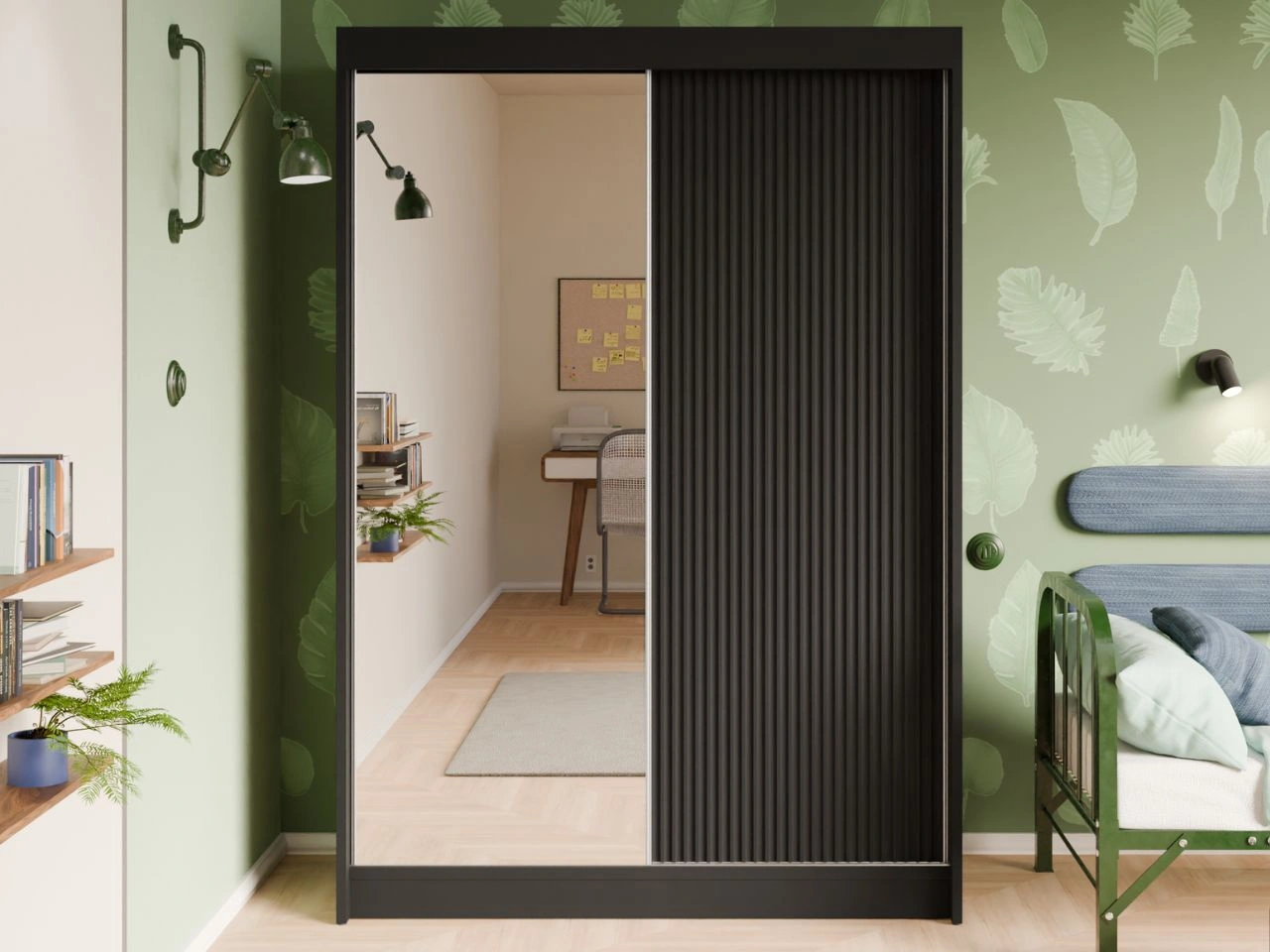 Schiebetürenschrank mit geriffelter Front und Spiegel 150 cm Fano Schwarz