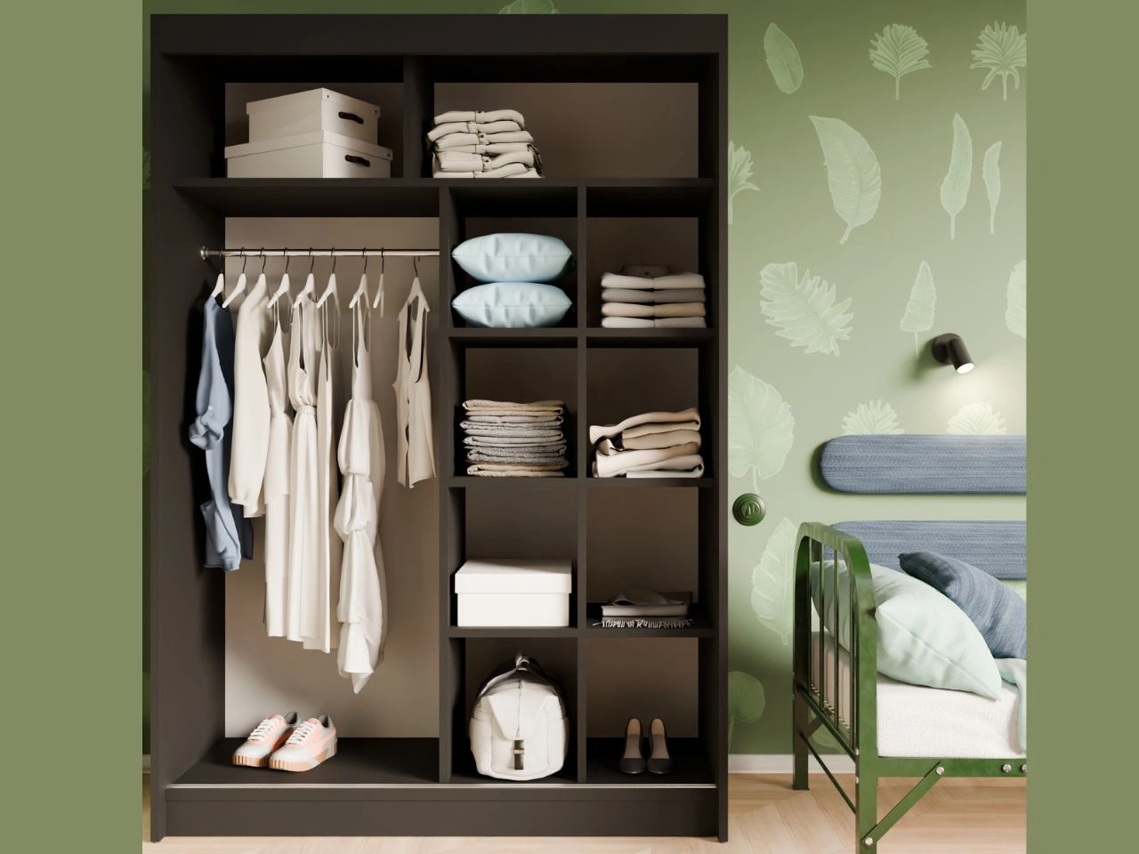 Der Innenraum des Schranks Fano ist funktional gestaltet und mit Kleiderstangen sowie praktischen Einlegeböden ausgestattet, die eine übersichtliche Aufbewahrung von Kleidung und Accessoires ermöglichen.