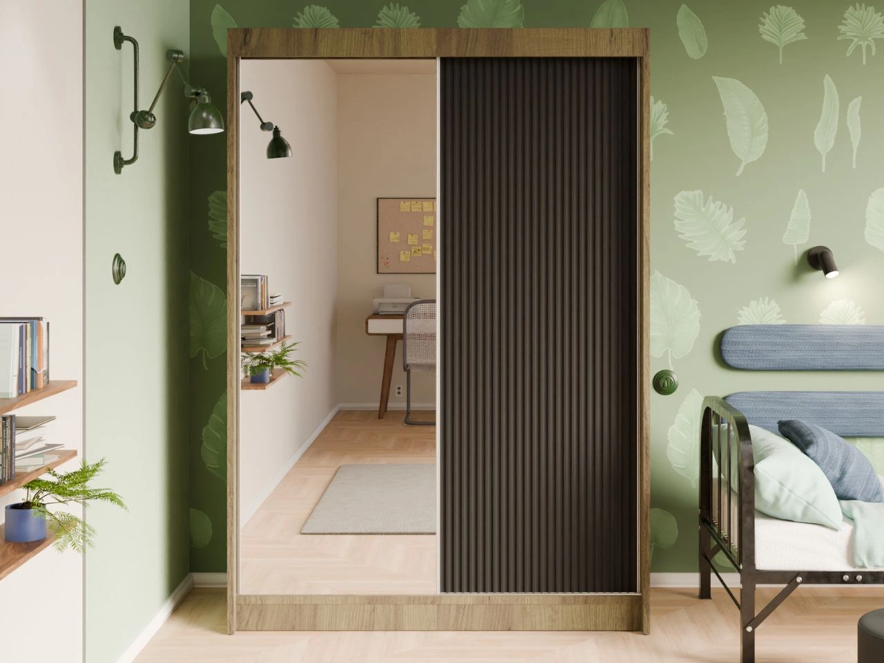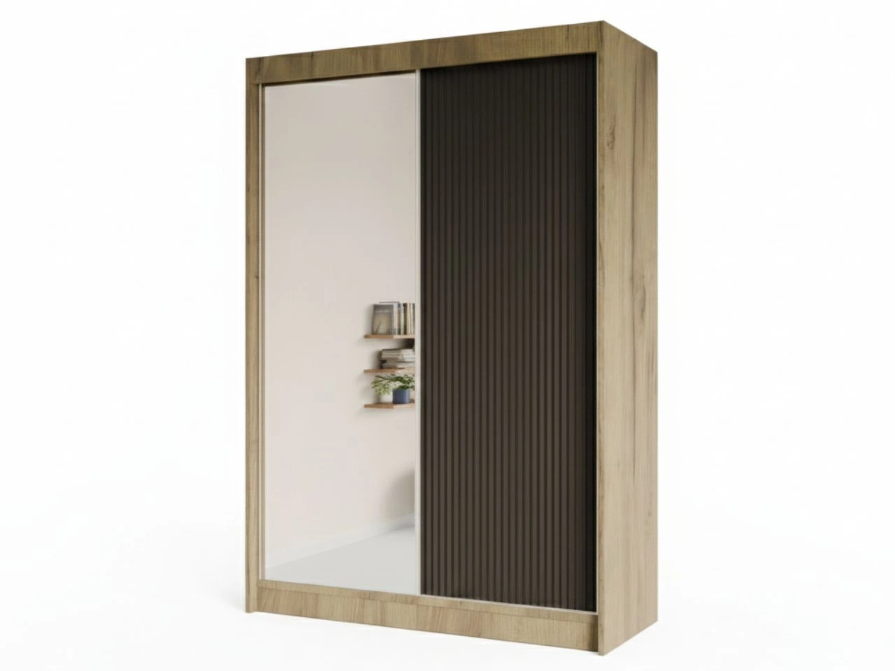 Schiebetürenschrank mit geriffelter Front und Spiegel 150 cm Fano Handwerk Goldene Eiche, Schwarz