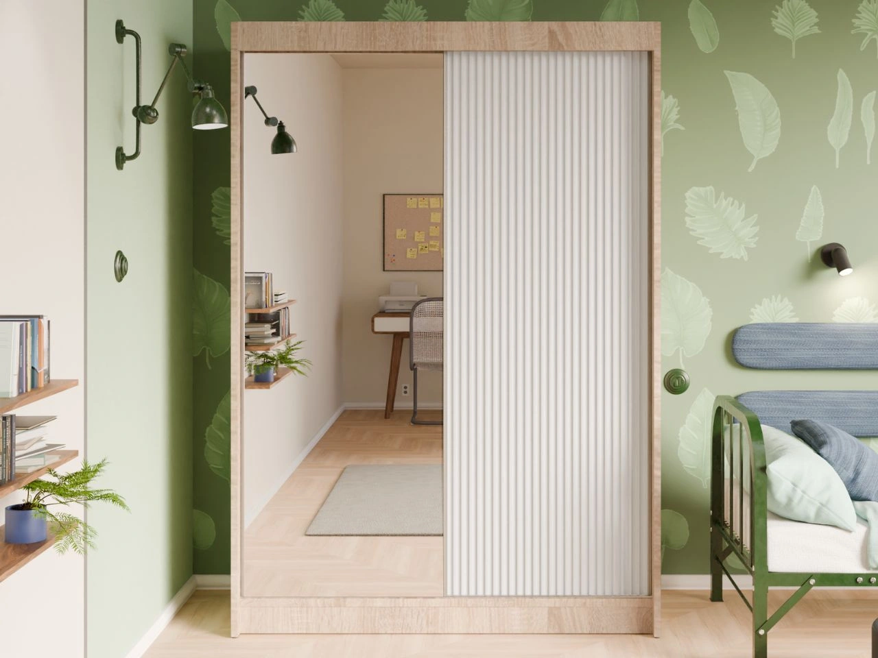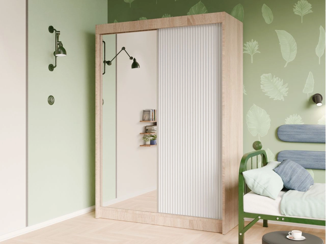 Schiebetürenschrank mit geriffelter Front und Spiegel 150 cm Fano Eiche Sonoma, Weiß