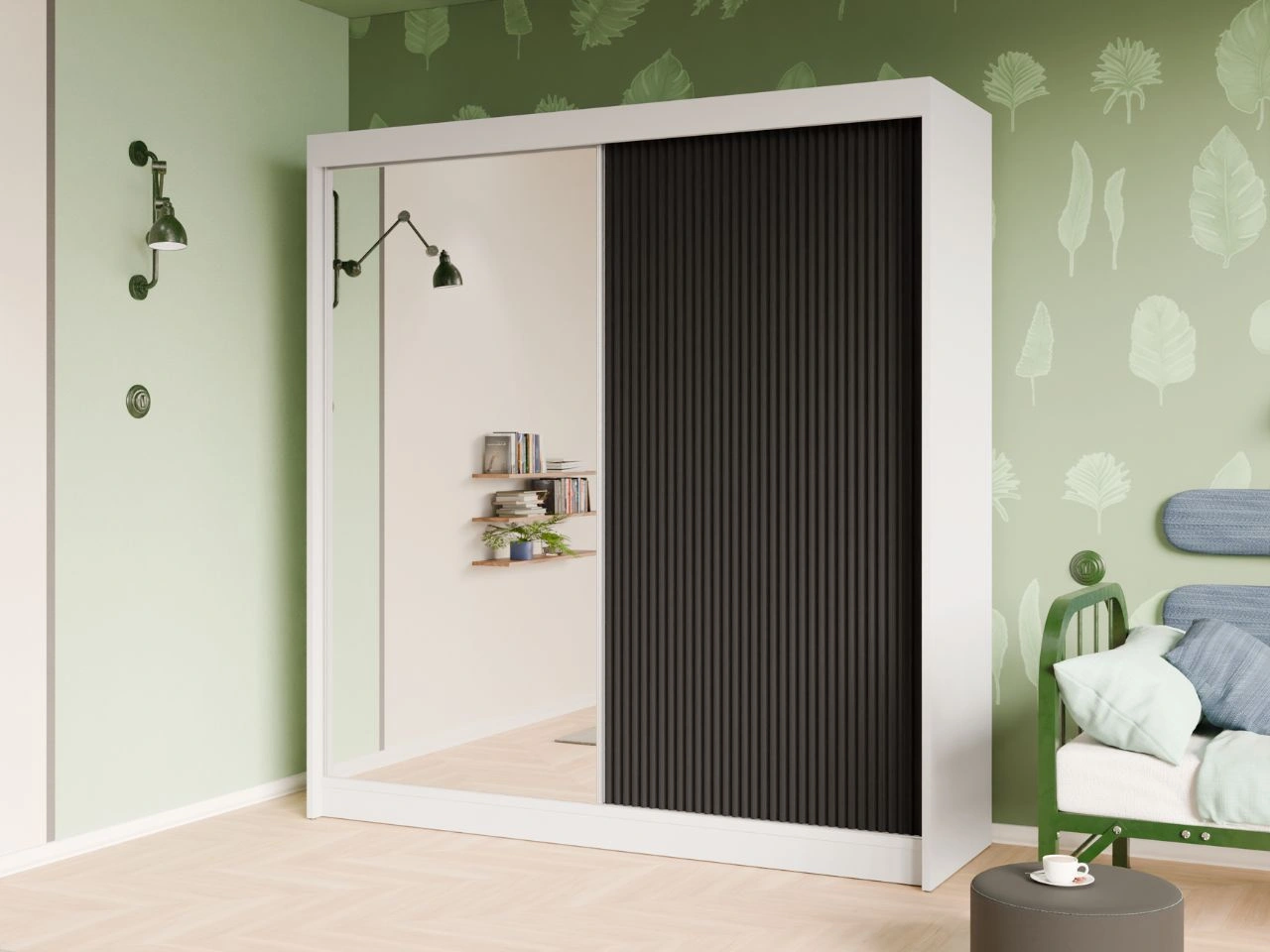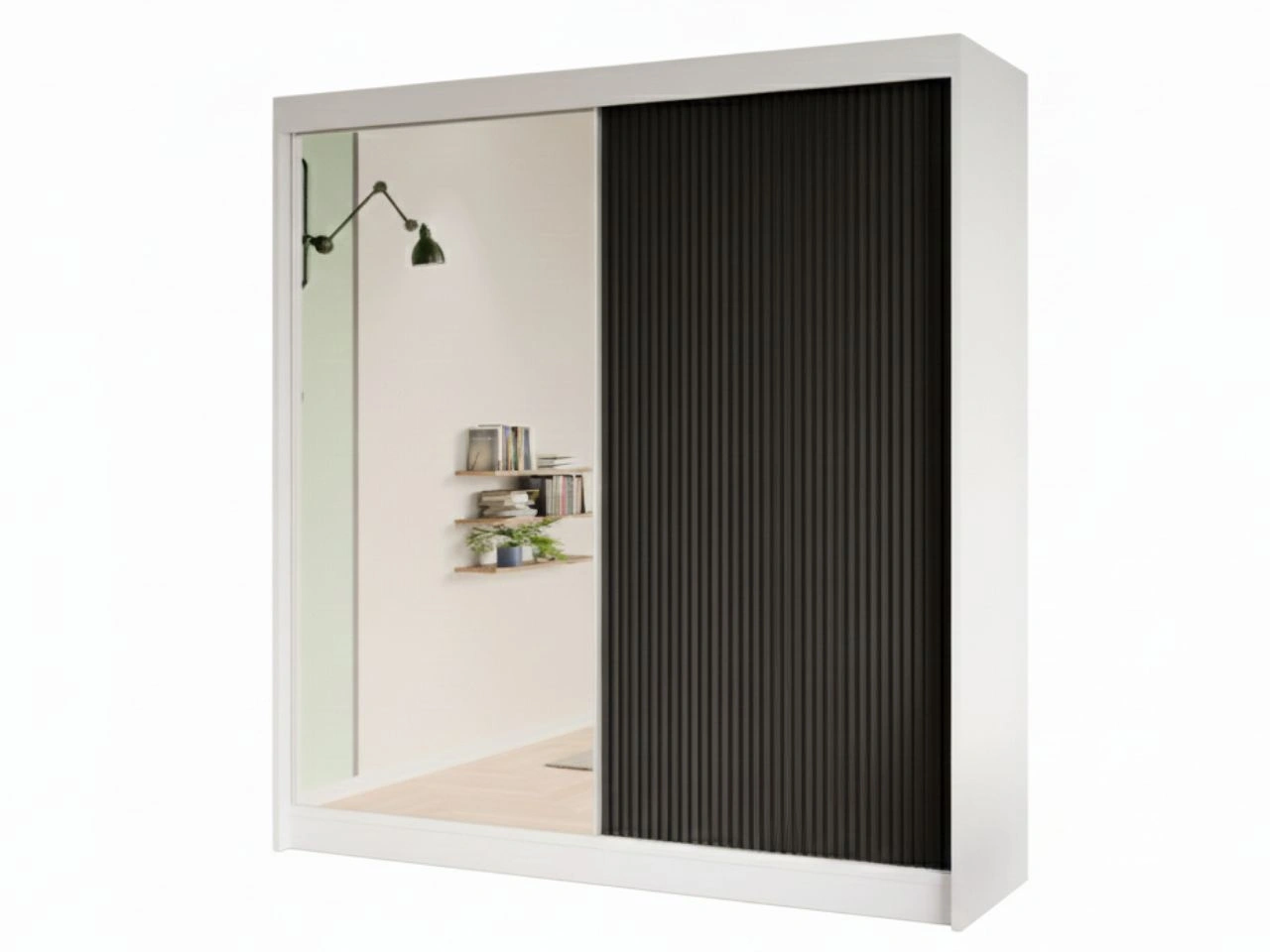 Schiebetürenschrank mit geriffelter Front und Spiegel 200 cm Fano Weiß, Schwarz