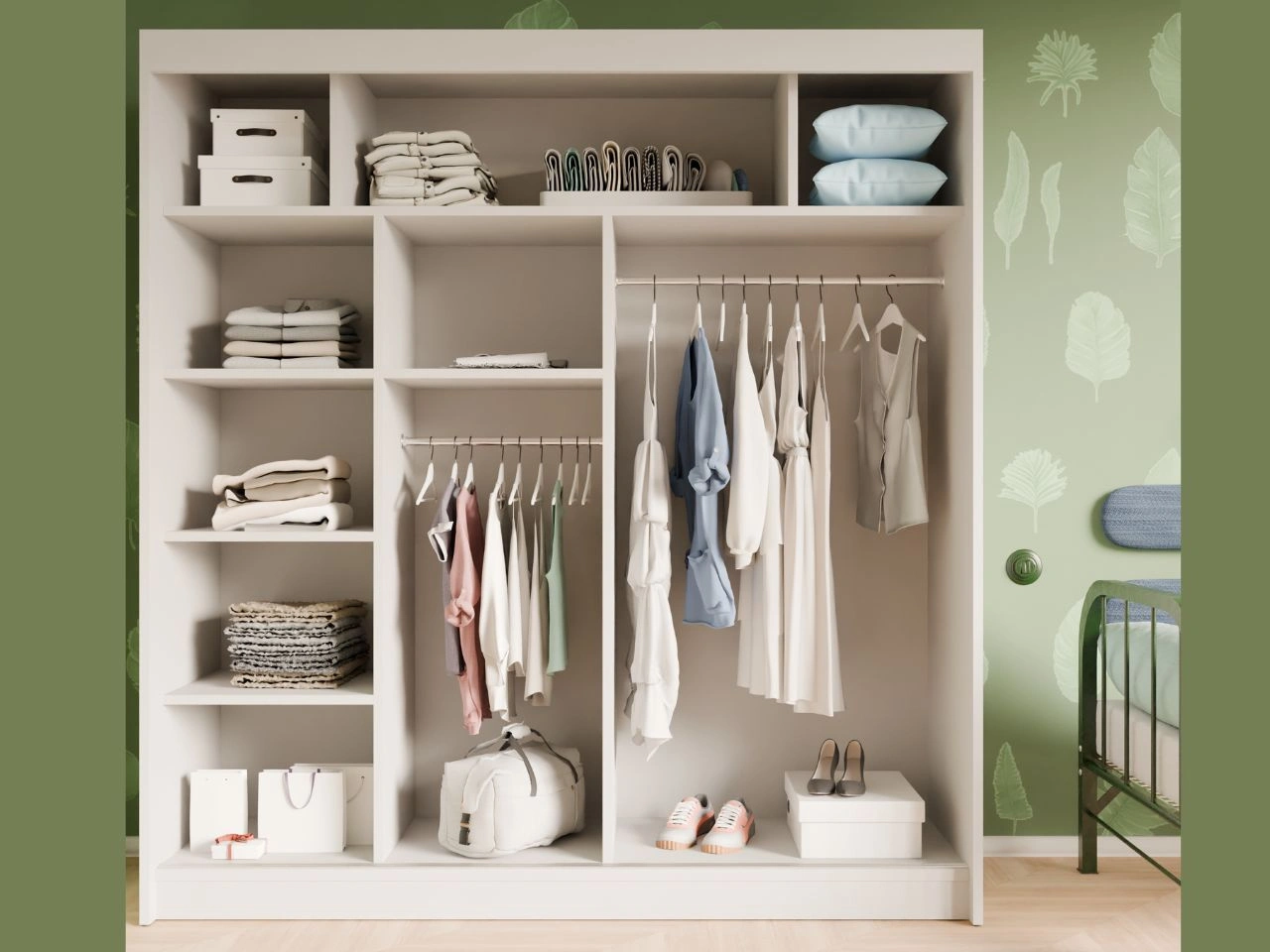 Der Innenraum des Schranks Fano wurde funktional gestaltet und ist mit Kleiderstangen sowie praktischen Einlegeböden ausgestattet, die eine übersichtliche Organisation von Kleidung und Accessoires ermöglichen.