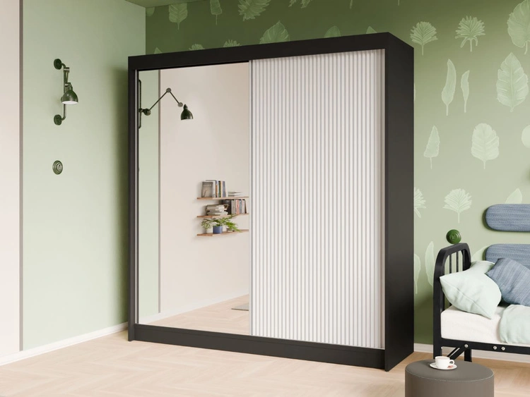 Schiebetürenschrank mit geriffelter Front und Spiegel 200 cm Fano Schwarz, Weiß