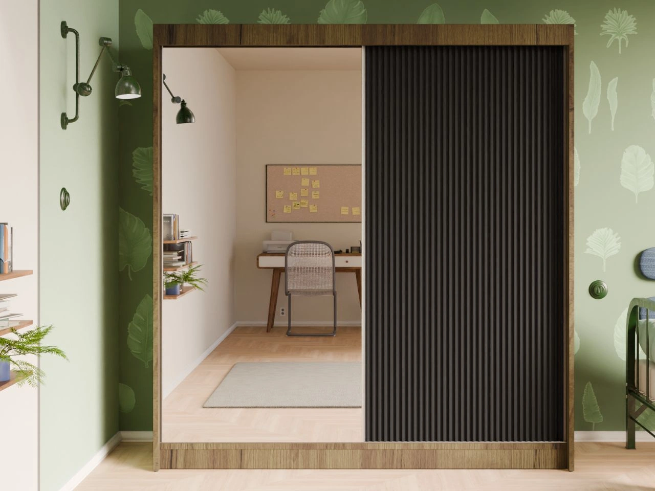 Schiebetürenschrank mit geriffelter Front und Spiegel 200 cm Fano Handwerk Goldene Eiche, Schwarz