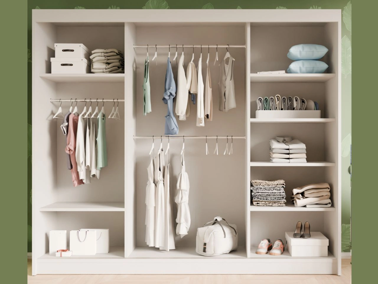 Der Innenraum des Schranks Fano wurde auf funktionale Aufbewahrung ausgelegt und ist mit Kleiderstangen sowie praktischen Einlegeböden ausgestattet, die eine übersichtliche Organisation von Kleidung, Accessoires und weiteren Utensilien ermöglichen.