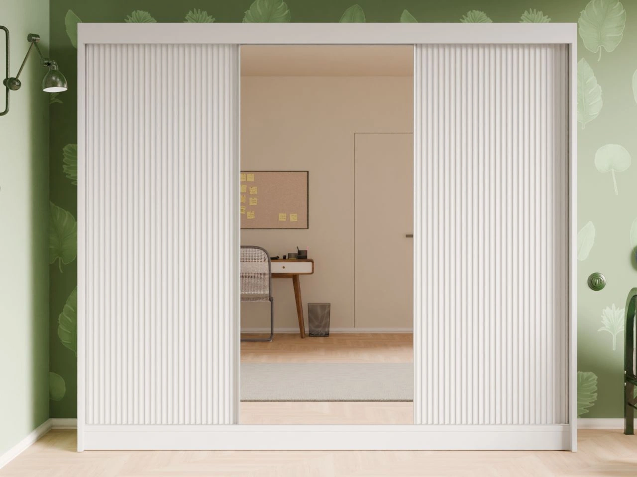 Der Schwebetürenschrank Fano ist eine moderne und elegante Lösung für Schlafzimmer, Ankleidezimmer oder Flur. Die minimalistische Form wird durch die Kombination aus vertikal geriffelten MDF-Fronten und einer mittigen Spiegelfront ergänzt, wodurch der Schrank leicht wirkt und den Raum optisch vergrößert.
