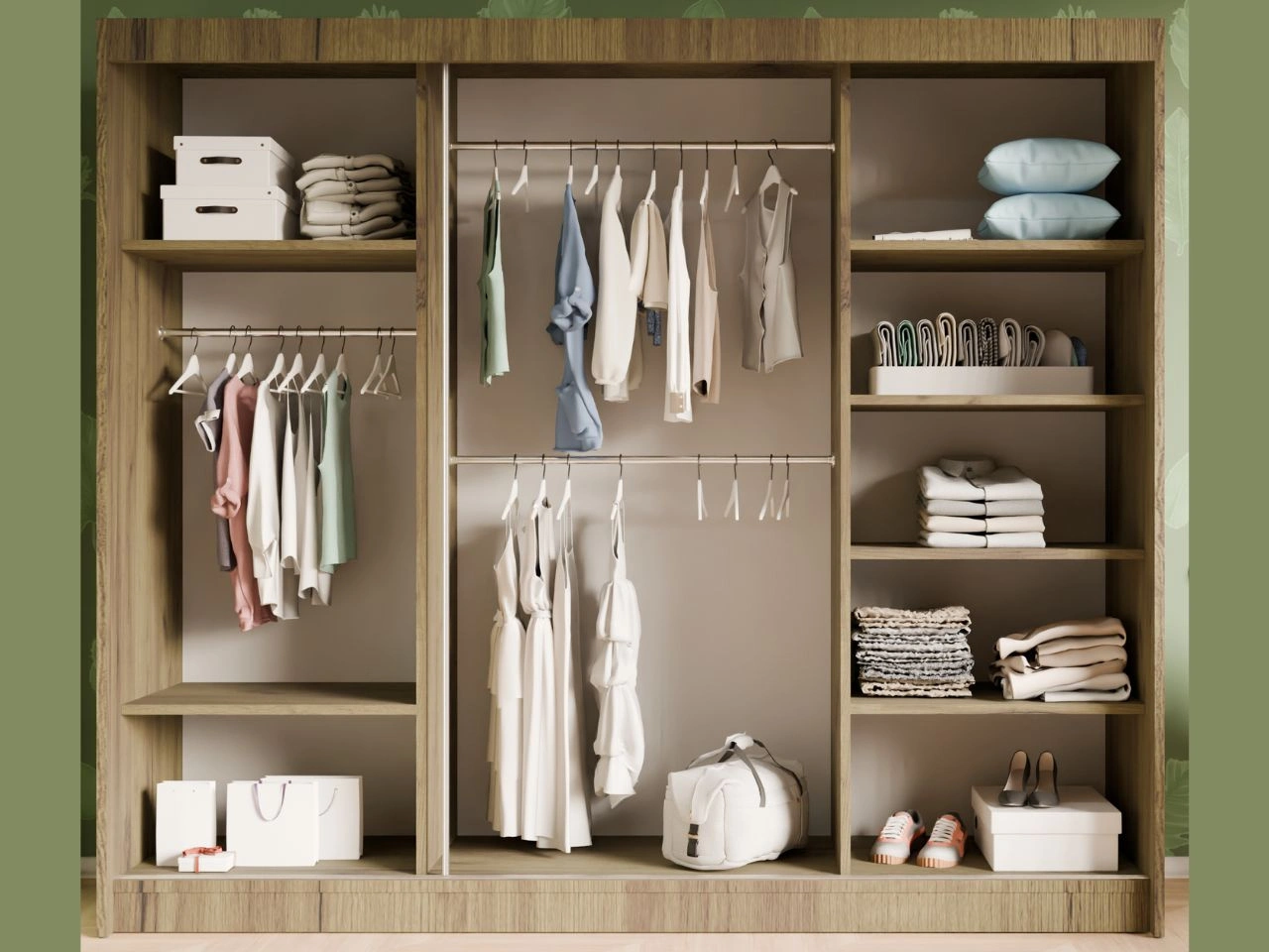 Der Innenraum des Schranks Fano wurde auf funktionale Aufbewahrung ausgelegt und ist mit Kleiderstangen sowie praktischen Einlegeböden ausgestattet, die eine übersichtliche Organisation von Kleidung, Accessoires und weiteren Utensilien ermöglichen.