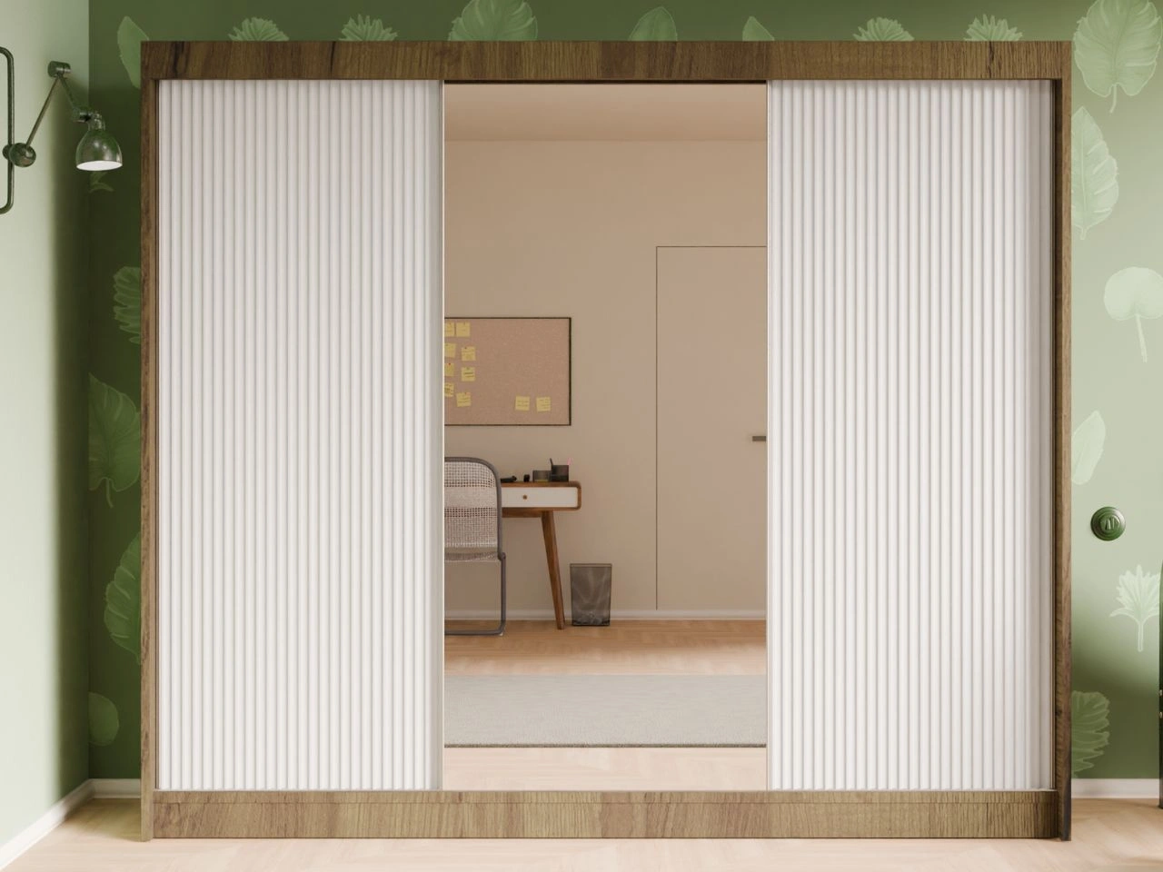 Der Schwebetürenschrank Fano ist eine moderne und elegante Lösung für Schlafzimmer, Ankleidezimmer oder Flur. Die minimalistische Form wird durch die Kombination aus vertikal geriffelten MDF-Fronten und einer mittigen Spiegelfront ergänzt, wodurch der Schrank leicht wirkt und den Raum optisch vergrößert.