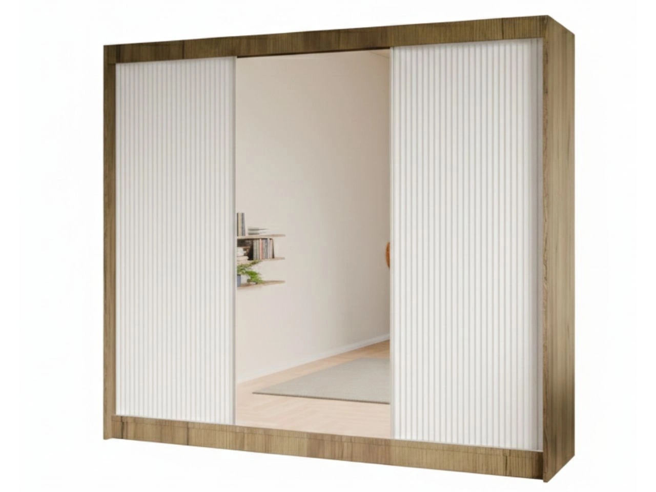 Schiebetürenschrank mit geriffelter Front und Spiegel 250 cm Fano Handwerk Goldene Eiche, Weiß