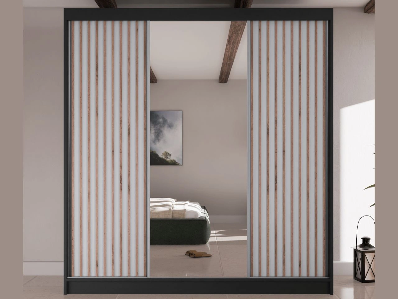 Schiebetürenschrank mit Lamellen und Spiegel 200 cm Lucena Schwarz, Weiß