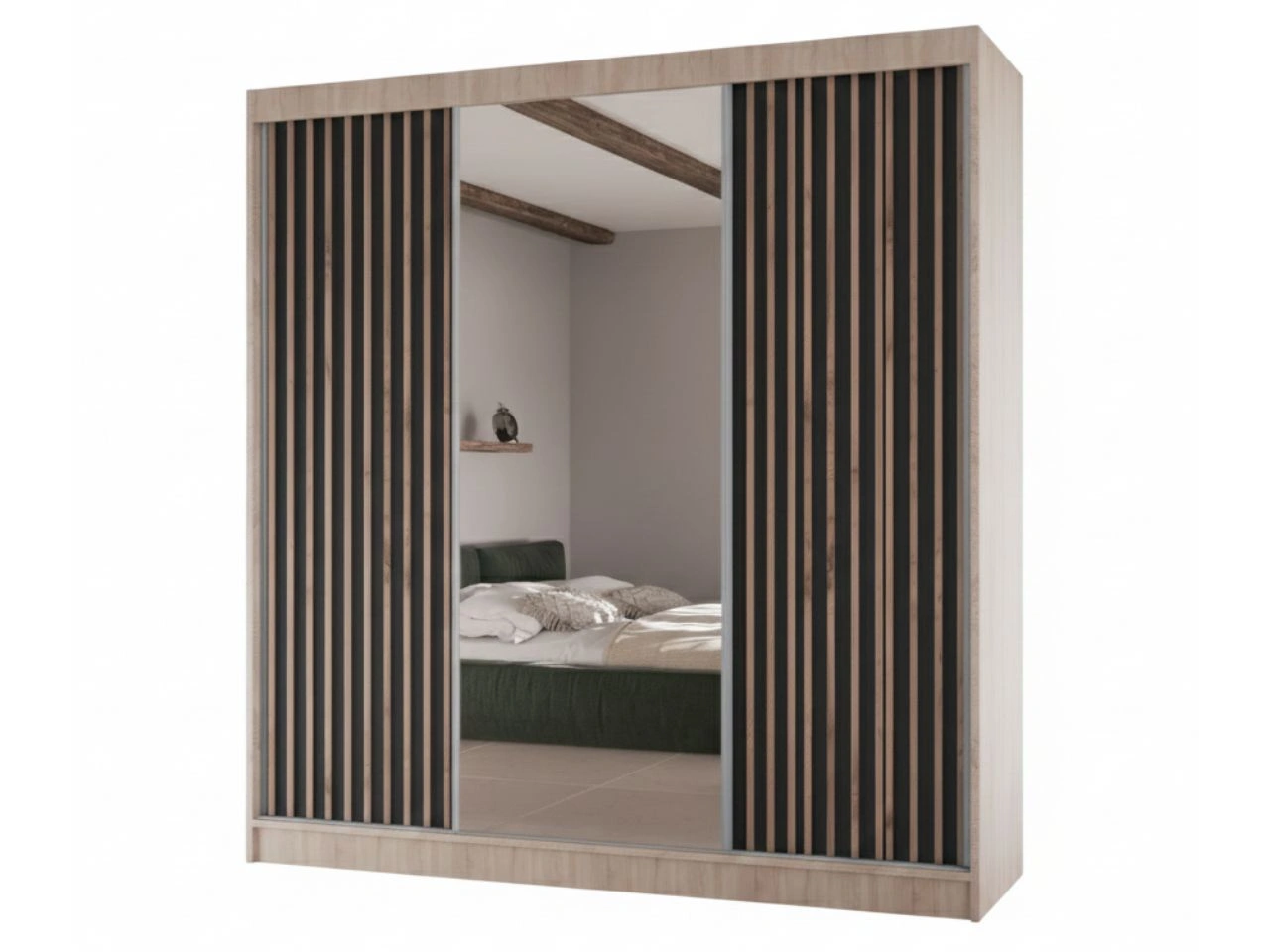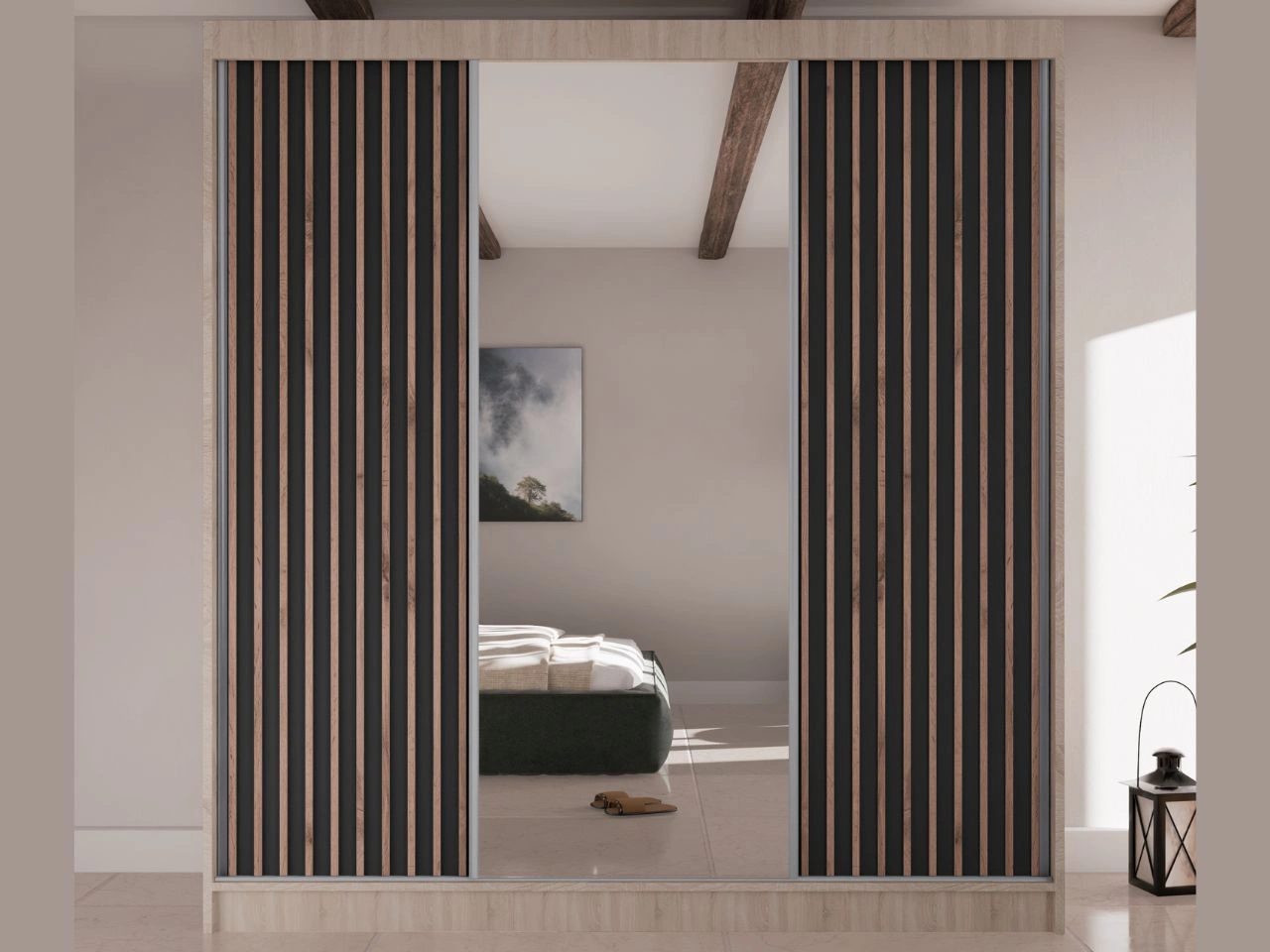 Schiebetürenschrank mit Lamellen und Spiegel 200 cm Lucena Eiche Sonoma, Schwarz