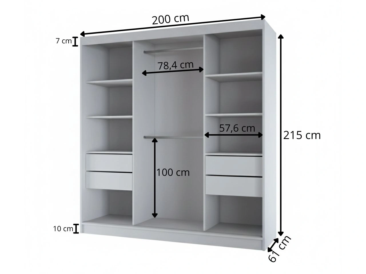 Der Innenraum des Schranks Lucena wurde mit Blick auf eine komfortable Organisation gestaltet. Die Ausstattung umfasst Bereiche mit Kleiderstangen, praktische Einlegeböden sowie Schubladen, die eine übersichtliche Aufbewahrung von Kleidung und Accessoires ermöglichen.