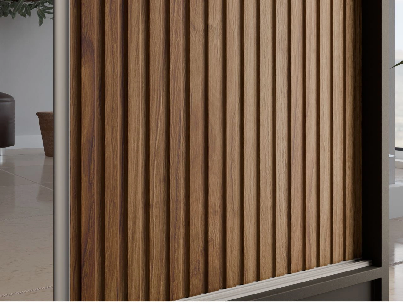Schwebetürenschrank Rivas ist ein moderner und geräumiger Kleiderschrank mit Schiebetüren, der für eine funktionale Gestaltung von Schlafzimmer, Ankleidezimmer und Flur konzipiert wurde. Die minimalistische Form wird durch vertikal geriffelte Fronten sowie einen zentralen Spiegel ergänzt, der den Raum aufhellt und optisch vergrößert.