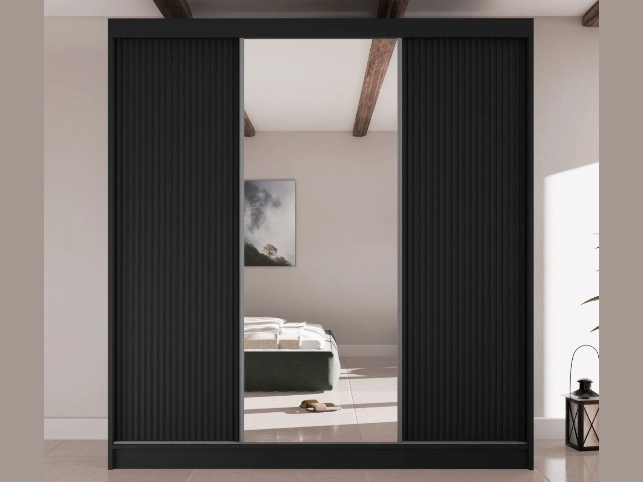 Du ziehst an: Schiebetürenschrank mit geriffelter Front und Spiegel 200 cm Rivas Schwarz