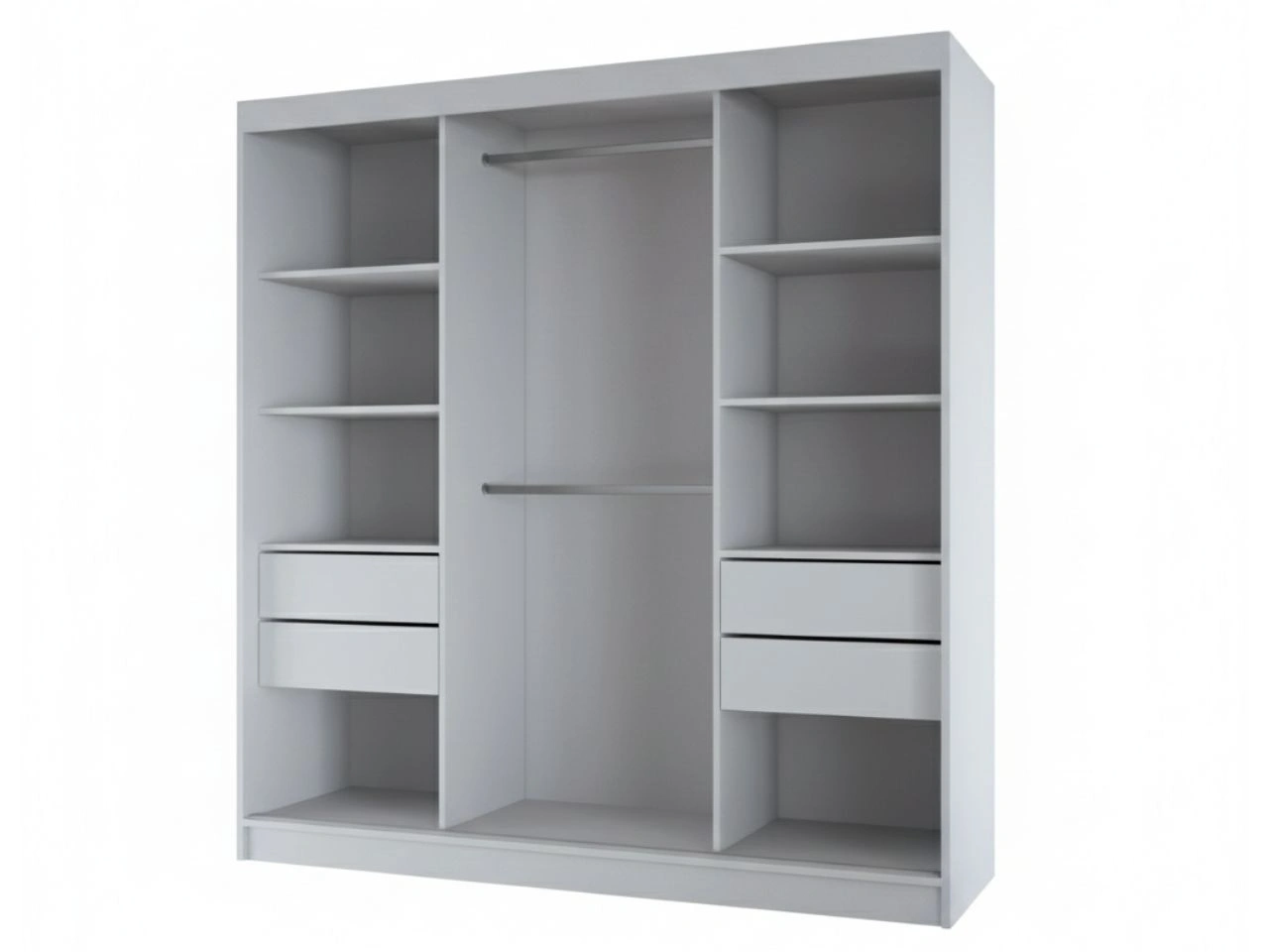 Hoher Nutzungskomfort wird durch das moderne Schiebetürensystem mit Aluminiumführungen und kugelgelagerten Laufrollen vom Typ FAST gewährleistet, die ein leises und gleichmäßiges Öffnen und Schließen ermöglichen. Zusätzlich ist der Schrank mit Schubladen auf Rollenführungen ausgestattet – ideal zur Aufbewahrung von Wäsche und Accessoires.