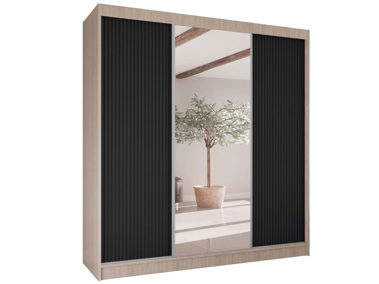 Schiebetürenschrank mit geriffelter Front und Spiegel 200 cm Rivas Eiche Sonoma, Schwarz