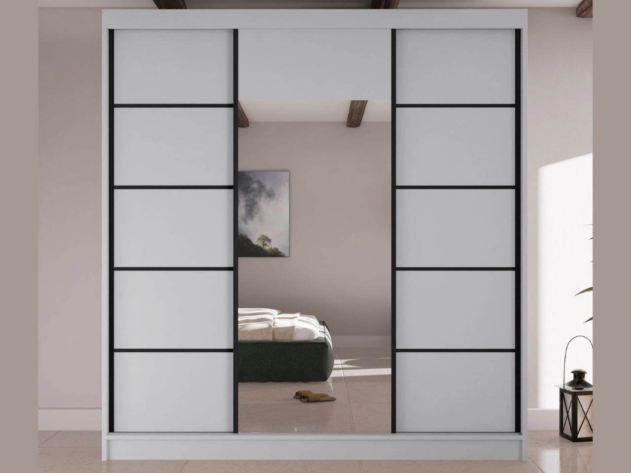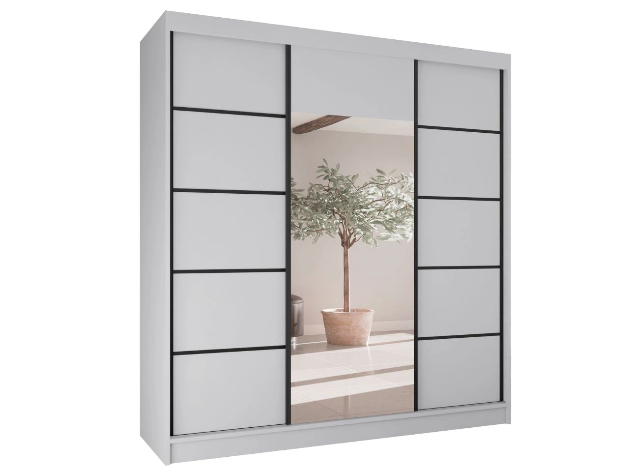 Schwebetürenschrank Maia ist ein moderner und eleganter Kleiderschrank, der für das Schlafzimmer, das Ankleidezimmer oder den Flur konzipiert wurde. Die klare, geometrische Form mit glatten Fronten wird durch einen zentral positionierten Spiegel ergänzt, der den Raum dezent aufhellt und optisch vergrößert, ohne die Gesamtwirkung des Möbels zu dominieren.