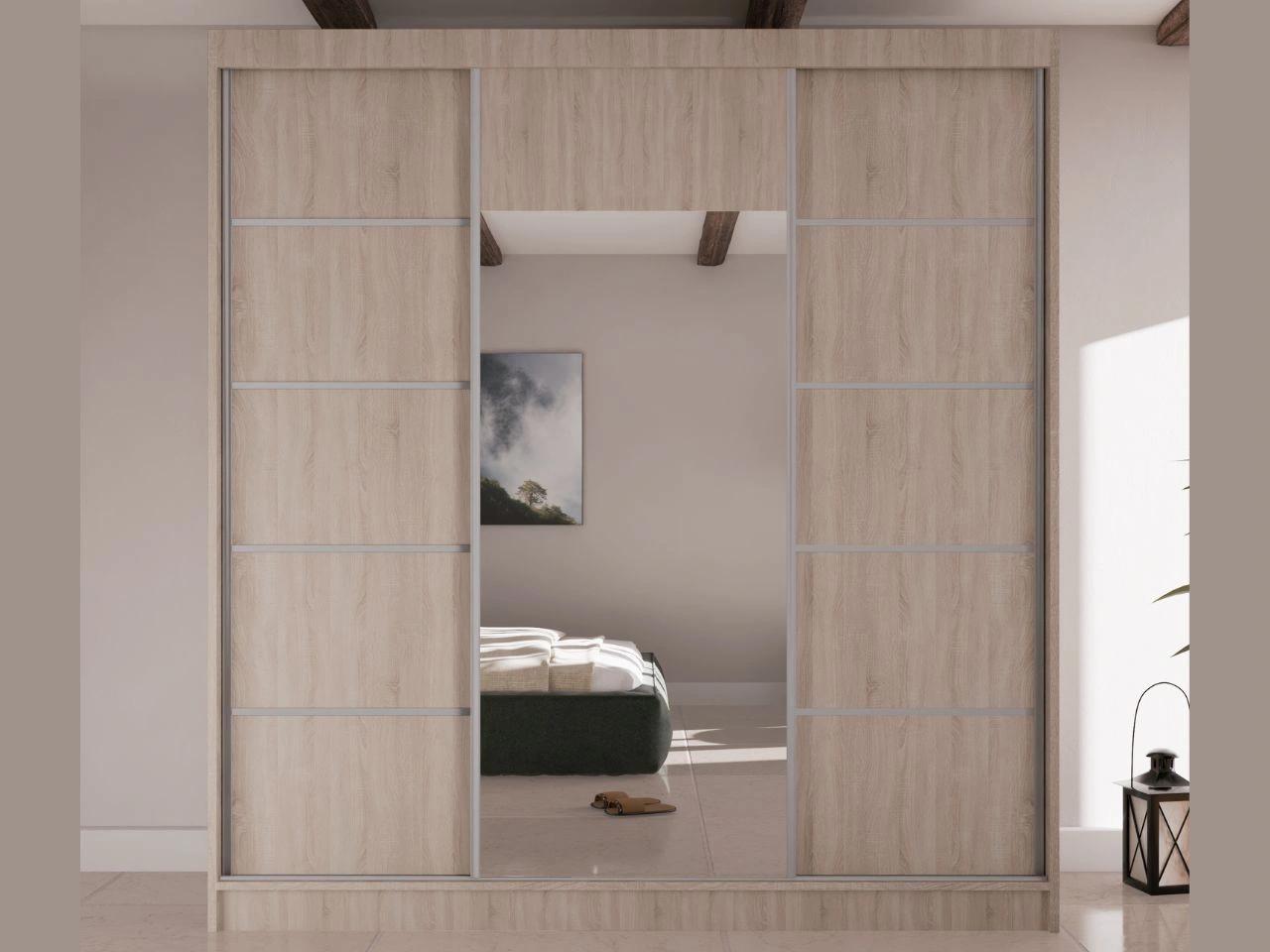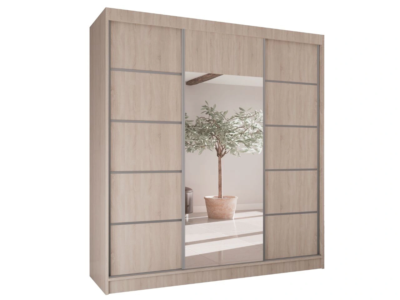 Schwebetürenschrank Maia ist ein moderner und eleganter Kleiderschrank, der für das Schlafzimmer, das Ankleidezimmer oder den Flur konzipiert wurde. Die klare, geometrische Form mit glatten Fronten wird durch einen zentral positionierten Spiegel ergänzt, der den Raum dezent aufhellt und optisch vergrößert, ohne die Gesamtwirkung des Möbels zu dominieren.