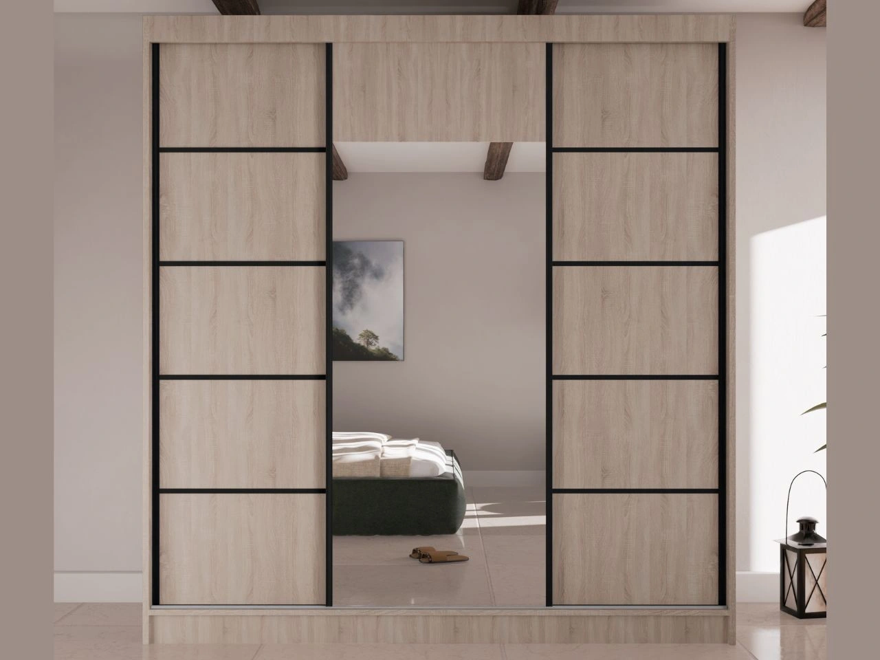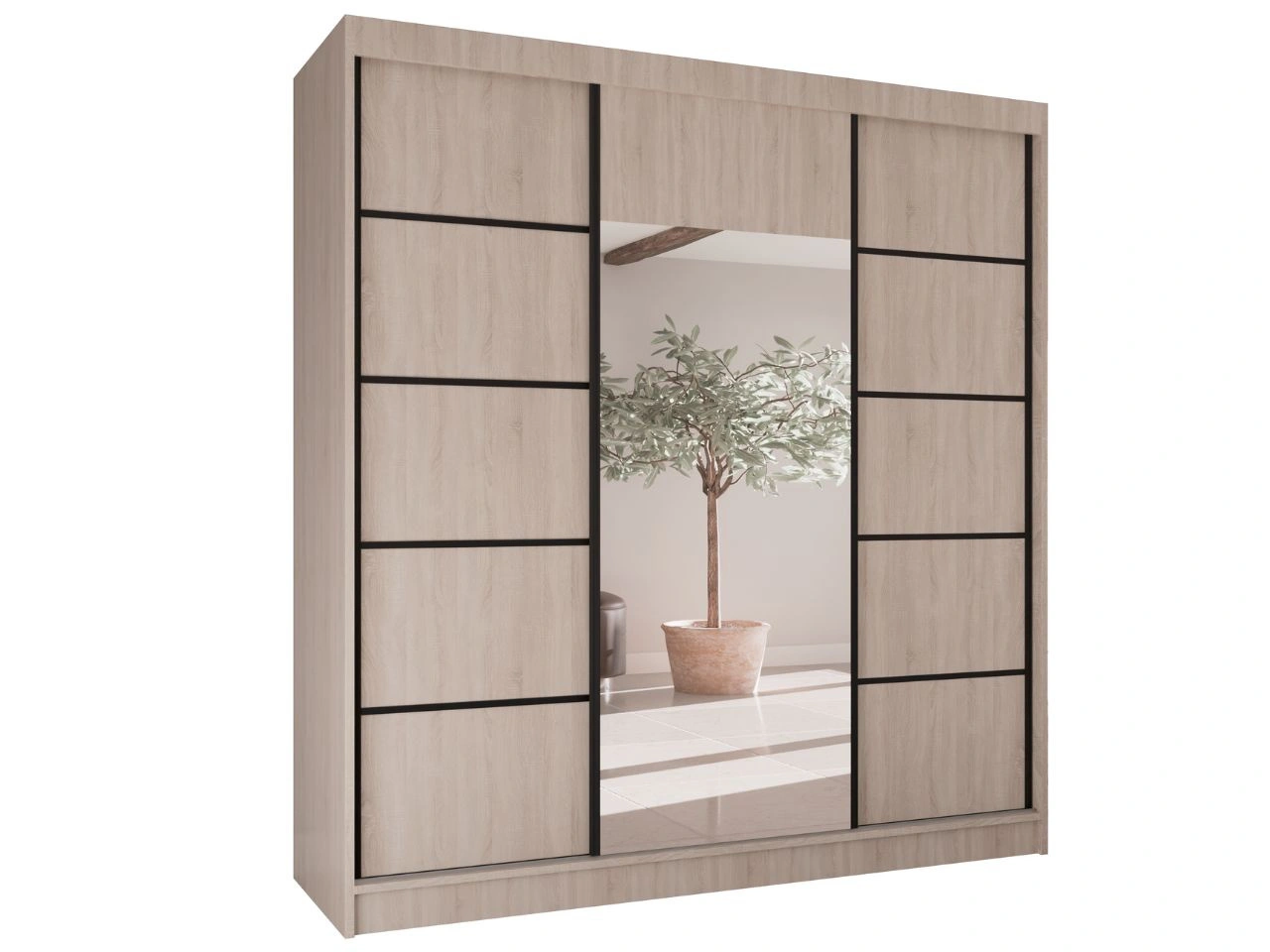 Schwebetürenschrank Maia ist ein moderner und eleganter Kleiderschrank, der für das Schlafzimmer, das Ankleidezimmer oder den Flur konzipiert wurde. Die klare, geometrische Form mit glatten Fronten wird durch einen zentral positionierten Spiegel ergänzt, der den Raum dezent aufhellt und optisch vergrößert, ohne die Gesamtwirkung des Möbels zu dominieren.