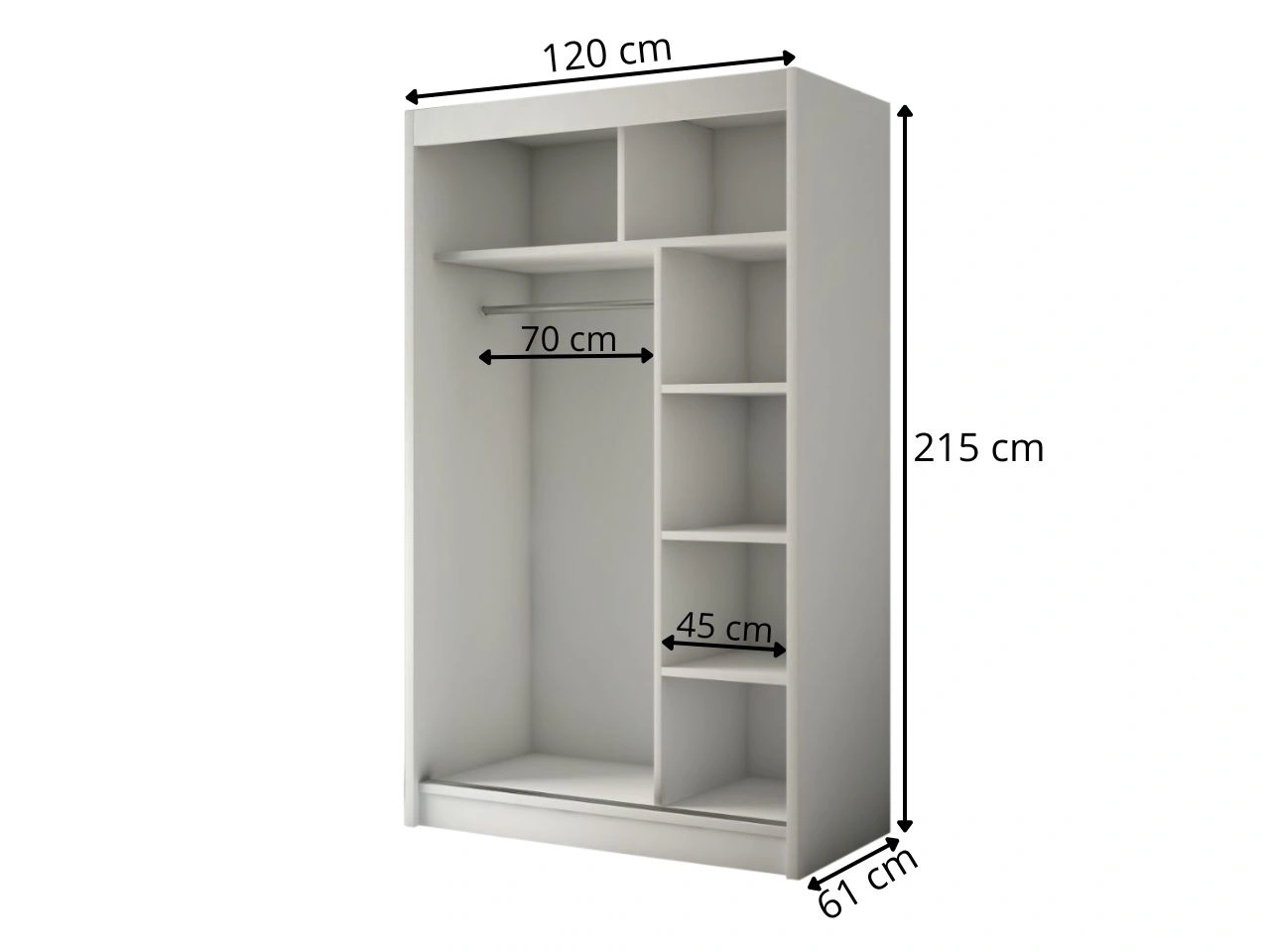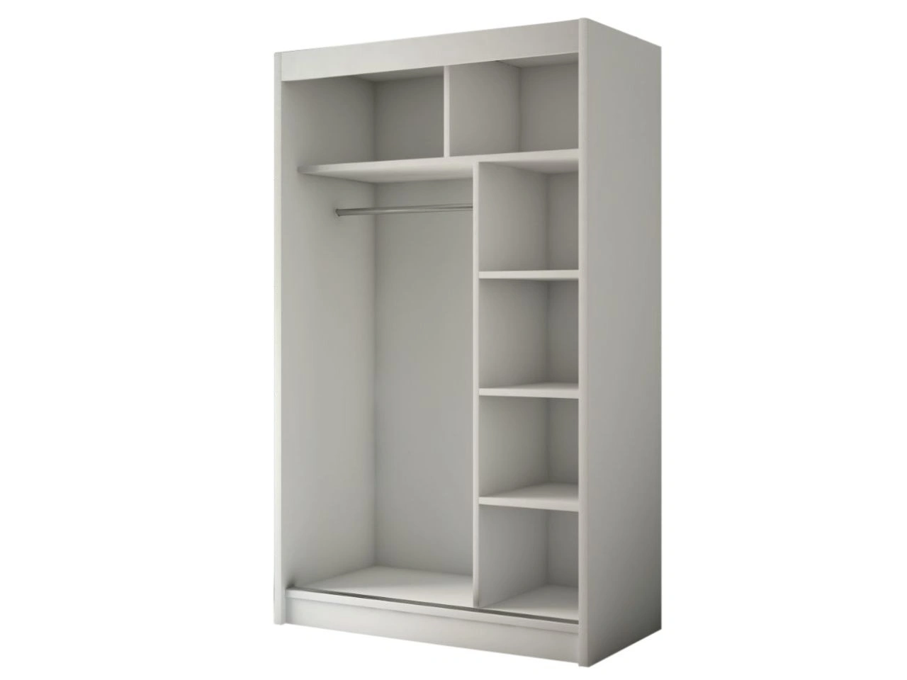 Der Innenraum des Schwebetürenschranks Loreto wurde mit Blick auf eine durchdachte Organisation gestaltet. Geräumige Einlegeböden bieten ausreichend Platz für gefaltete Kleidung, Boxen und Accessoires, während eine praktische Kleiderstange das übersichtliche Aufhängen von Hemden, Kleidern oder Jacken erlaubt. Dezente Aluminiumgriffe an den Kanten der Fronten unterstreichen den minimalistischen Look und erhöhen den Bedienkomfort.