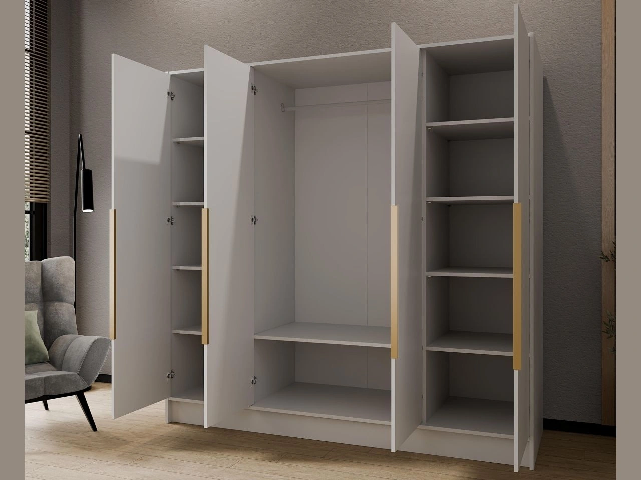 Der Innenraum des Schranks Perugia wurde auf flexible und komfortable Aufbewahrung ausgelegt. Es besteht die Möglichkeit, zwischen verschiedenen Innenvarianten zu wählen, sodass die Anordnung von Einlegeböden und Stauraum individuell angepasst werden kann. Der Schrank ermöglicht eine übersichtliche Organisation von Kleidung, Accessoires und weiteren Einrichtungsgegenständen.