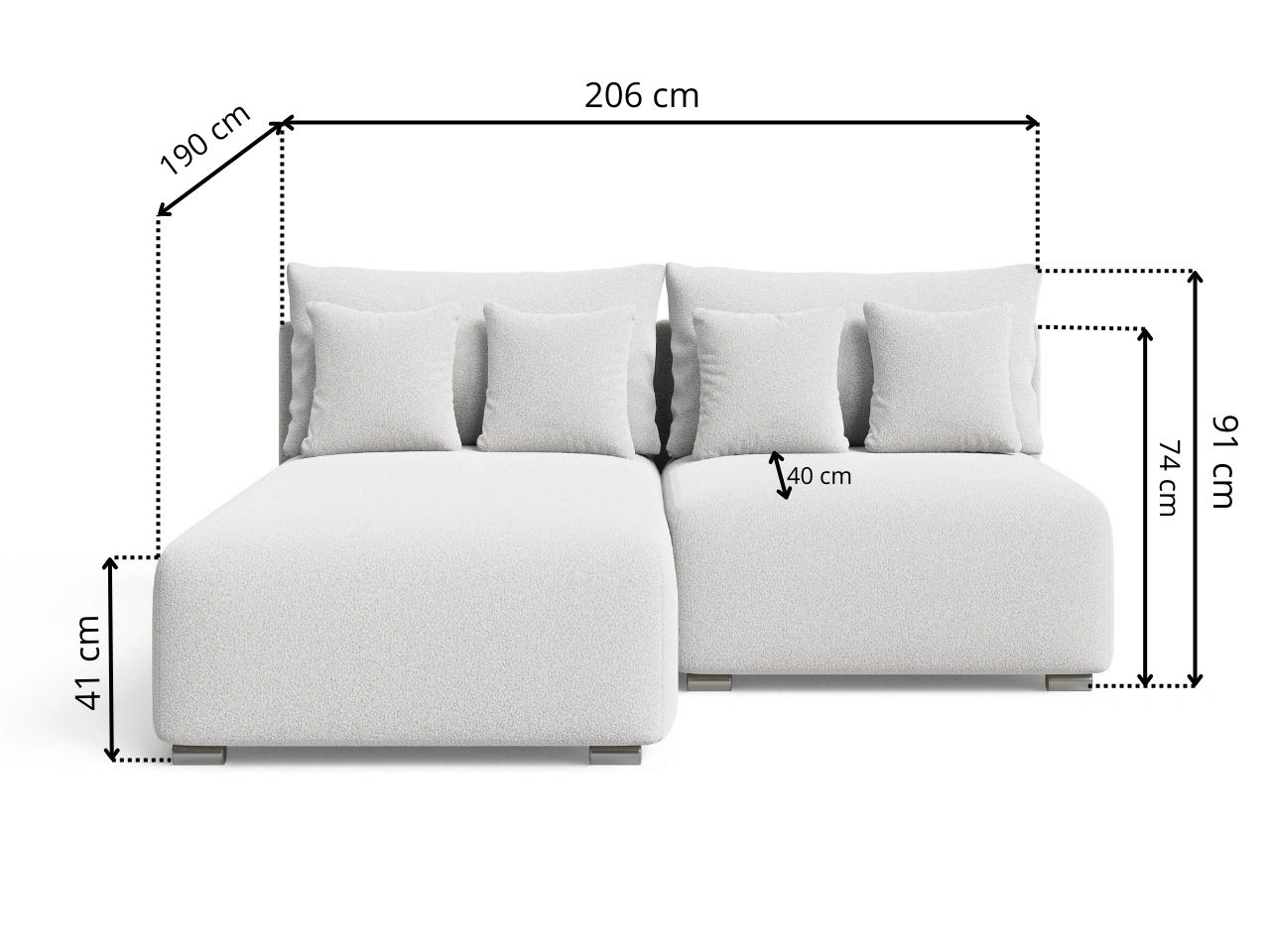 - Sitztiefe bis zu den Kissen: 40 cm