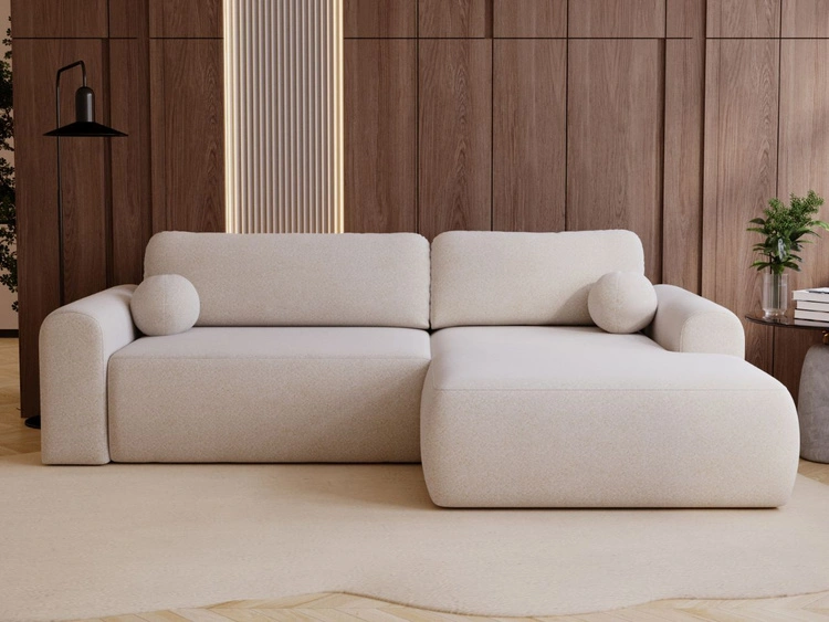 Das Ecksofa Savana überzeugt durch ein minimalistisches, modernes Design und fügt sich harmonisch in aktuelle Einrichtungstrends ein. Zwei große Rückenkissen bieten eine stabile Unterstützung für den Rücken, während die Sitzfläche aus einer Kombination von Wellenfedern und hochwertigem Polsterschaum für Elastizität, Langlebigkeit und Formbeständigkeit sorgt. Zusätzlich ist das Modell mit zwei Armlehnen sowie zwei kleinen, runden Dekokissen ausgestattet.