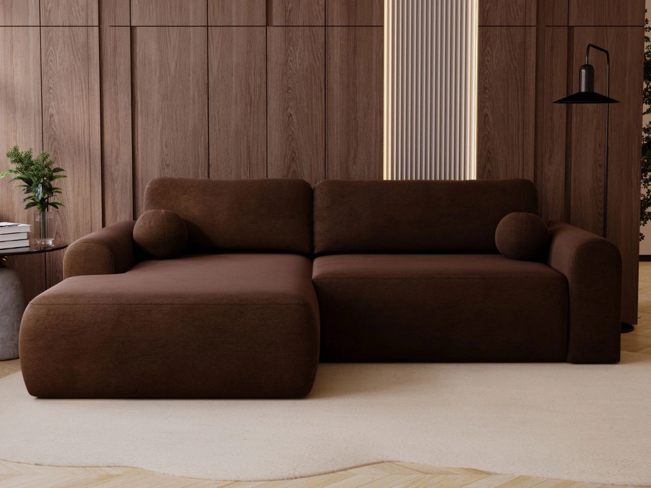 Das Ecksofa Savana überzeugt durch ein minimalistisches, modernes Design und fügt sich harmonisch in aktuelle Einrichtungstrends ein. Zwei große Rückenkissen bieten eine stabile Unterstützung für den Rücken, während die Sitzfläche aus einer Kombination von Wellenfedern und hochwertigem Polsterschaum für Elastizität, Langlebigkeit und Formbeständigkeit sorgt. Zusätzlich ist das Modell mit zwei Armlehnen sowie zwei kleinen, runden Dekokissen ausgestattet.
