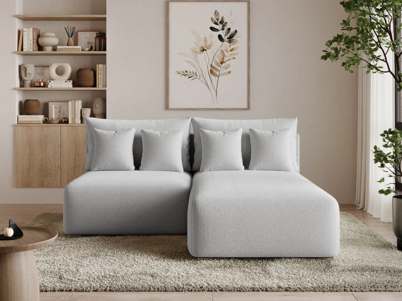 Ecksofa L-Form mit Schlaffunktion und Bettkasten Neva Bouclé-Stoff Weiß